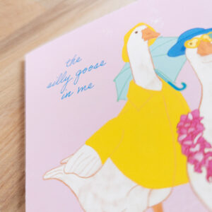 “The silly goose in me admires the silly goose in you” greeting card with two geese dressed in silly outfits. The back features a repeating goose and flower pattern. A2-sized card, kraft envelope included. Blank inside to write whatever you’d like!