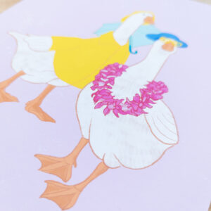 Art print with two geese dressed in silly outfits on a soft pink background. 8″x10″ print on premium 60lb/230gsm matte paper.