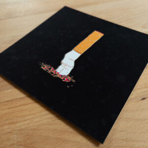 Small art print with a cigarette being put out on a rich black splattered background. 5″x5″ print on premium matte paper.