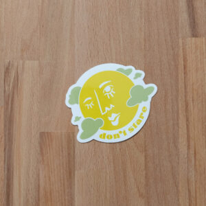 “Don’t Stare” die cut sticker with a winking sun surrounded by clouds. Available in green or purple! Features a starry holographic laminate finish.