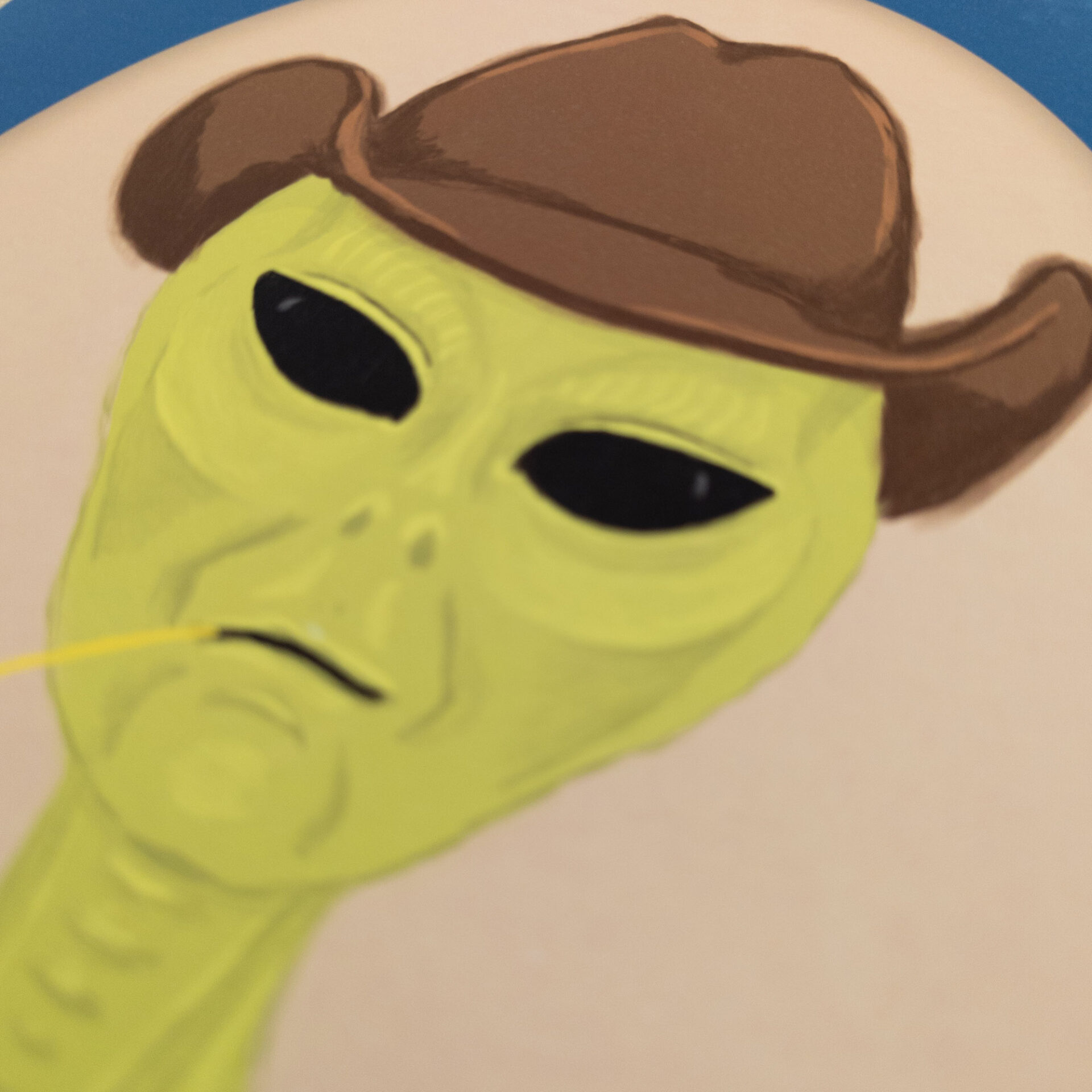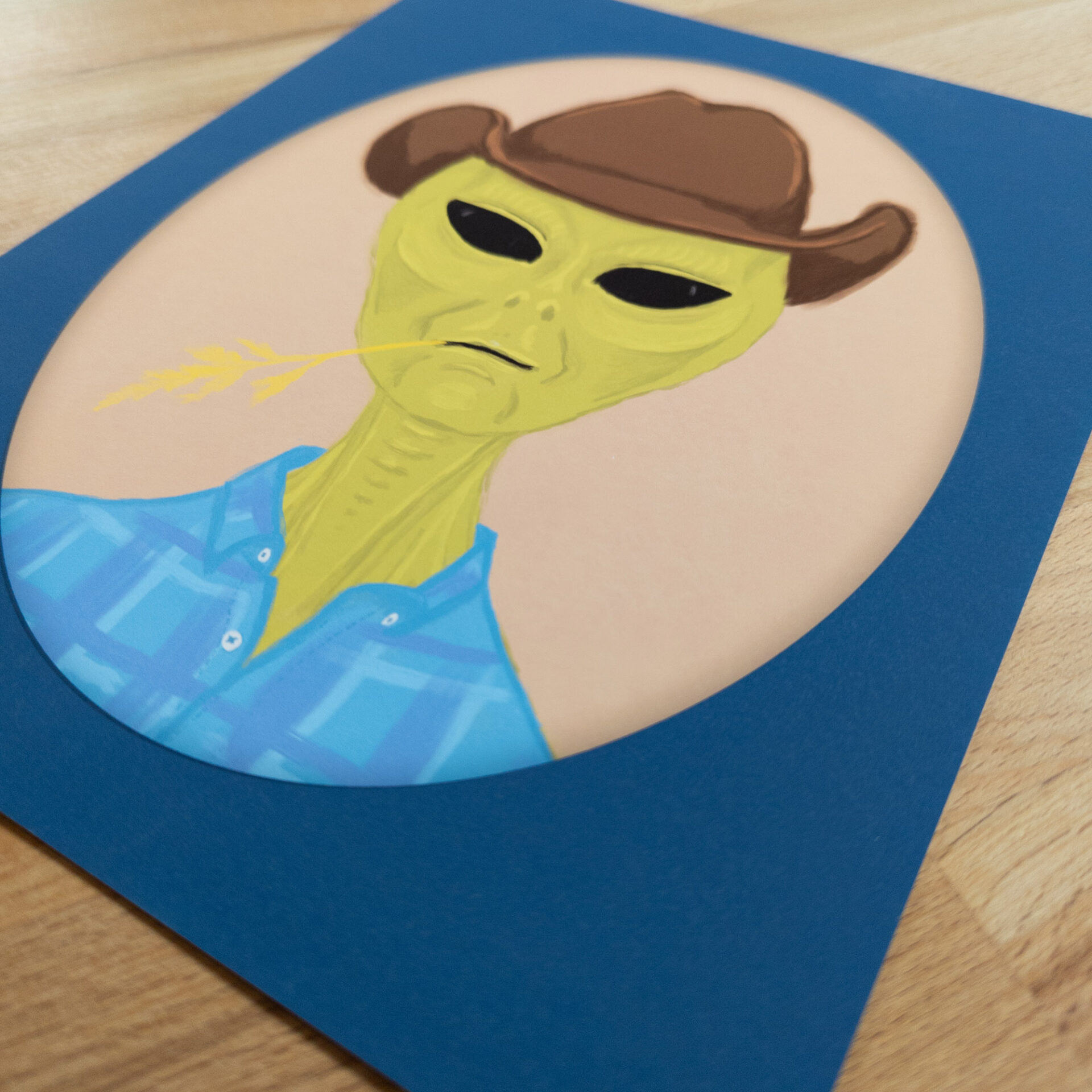 Art print with a portrait of a green alien wearing cowboy garb and chewing on some wheat, classic Americana. Features a blue oval imitation matte, framing the art.