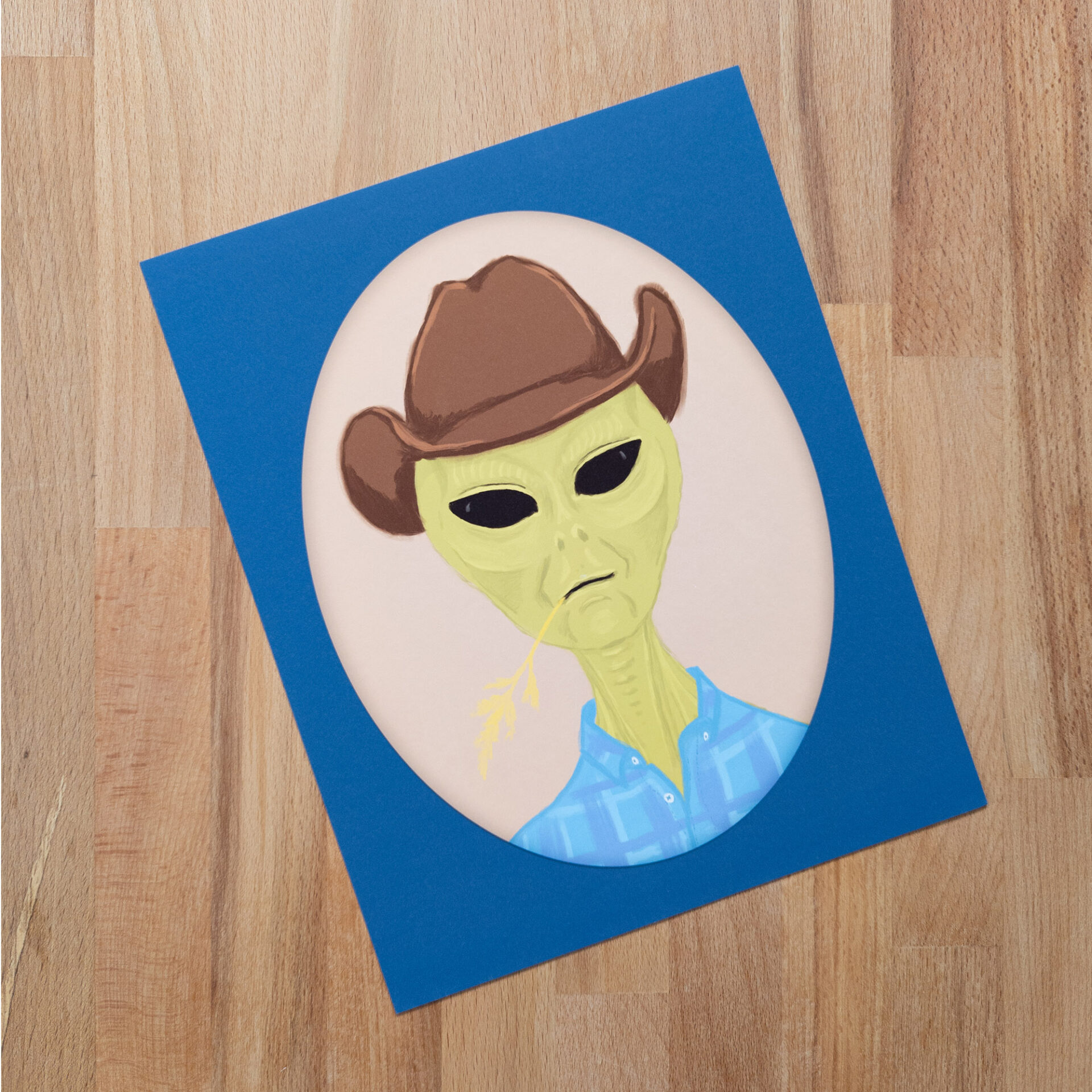 Art print with a portrait of a green alien wearing cowboy garb and chewing on some wheat, classic Americana. Features a blue oval imitation matte, framing the art. 8″x10″ print on premium 60lb/230gsm matte paper.