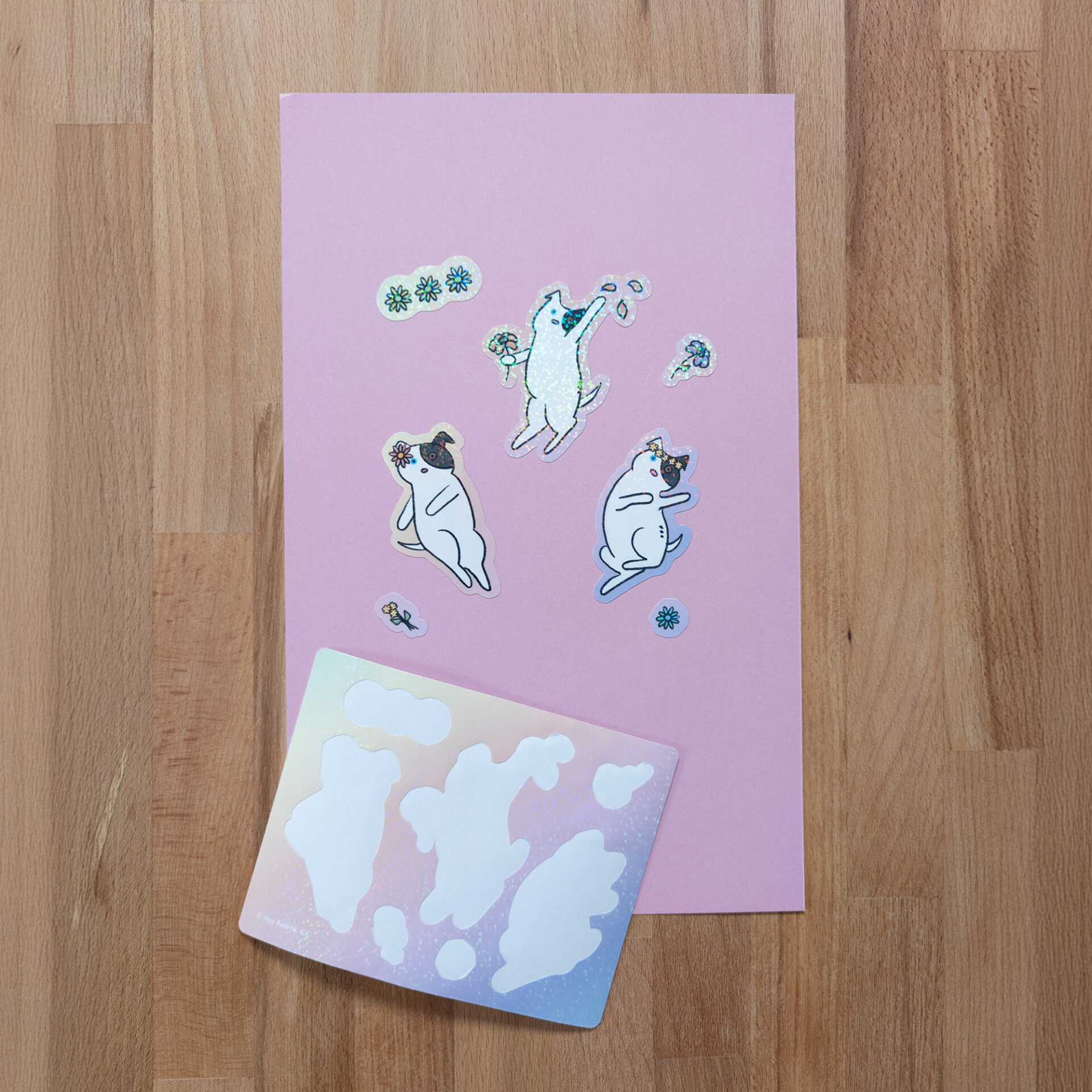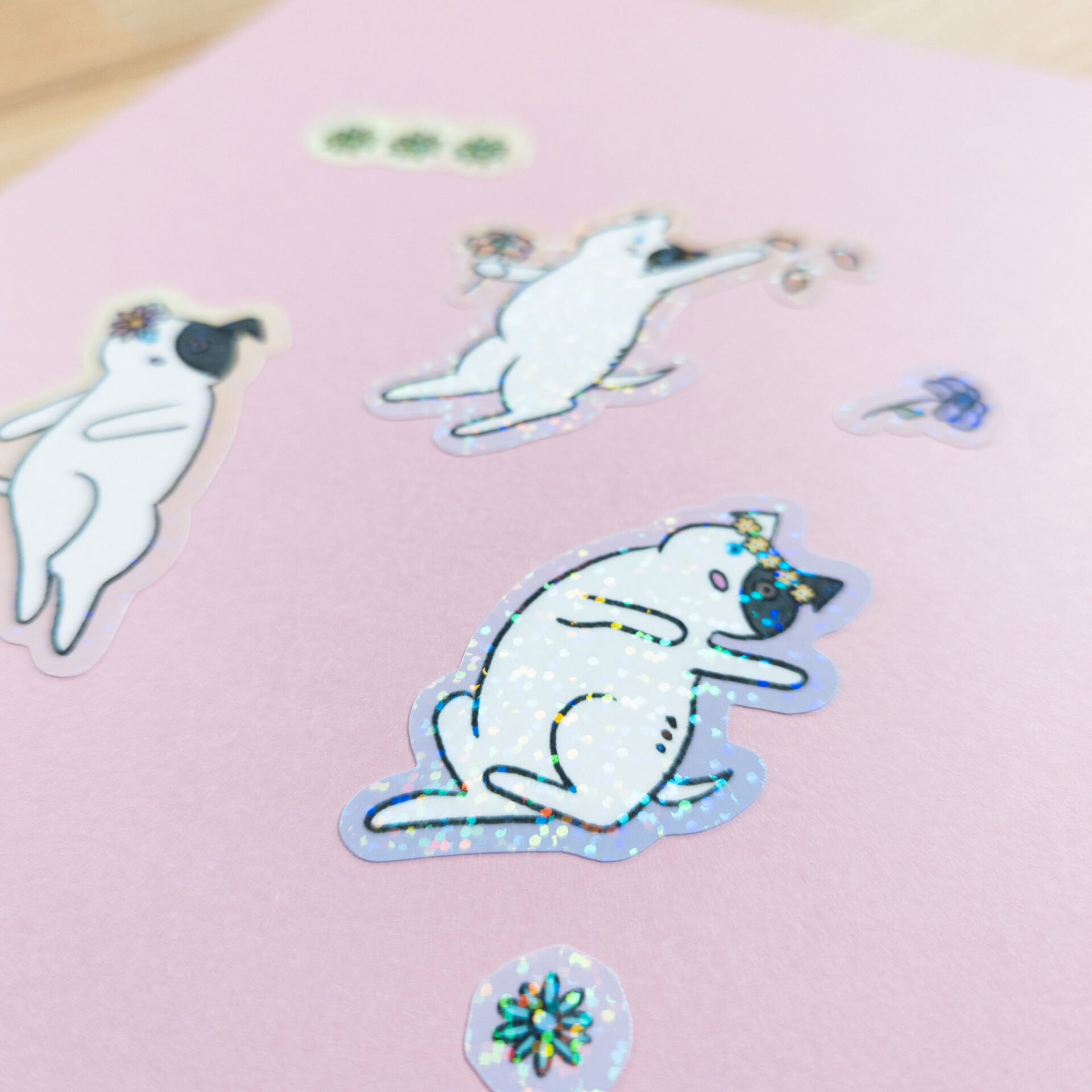Sticker sheet includes 7 kiss cut stickers (vary in size) with three different dancing dog designs and extra flowers. Features a holographic dot laminate finish.