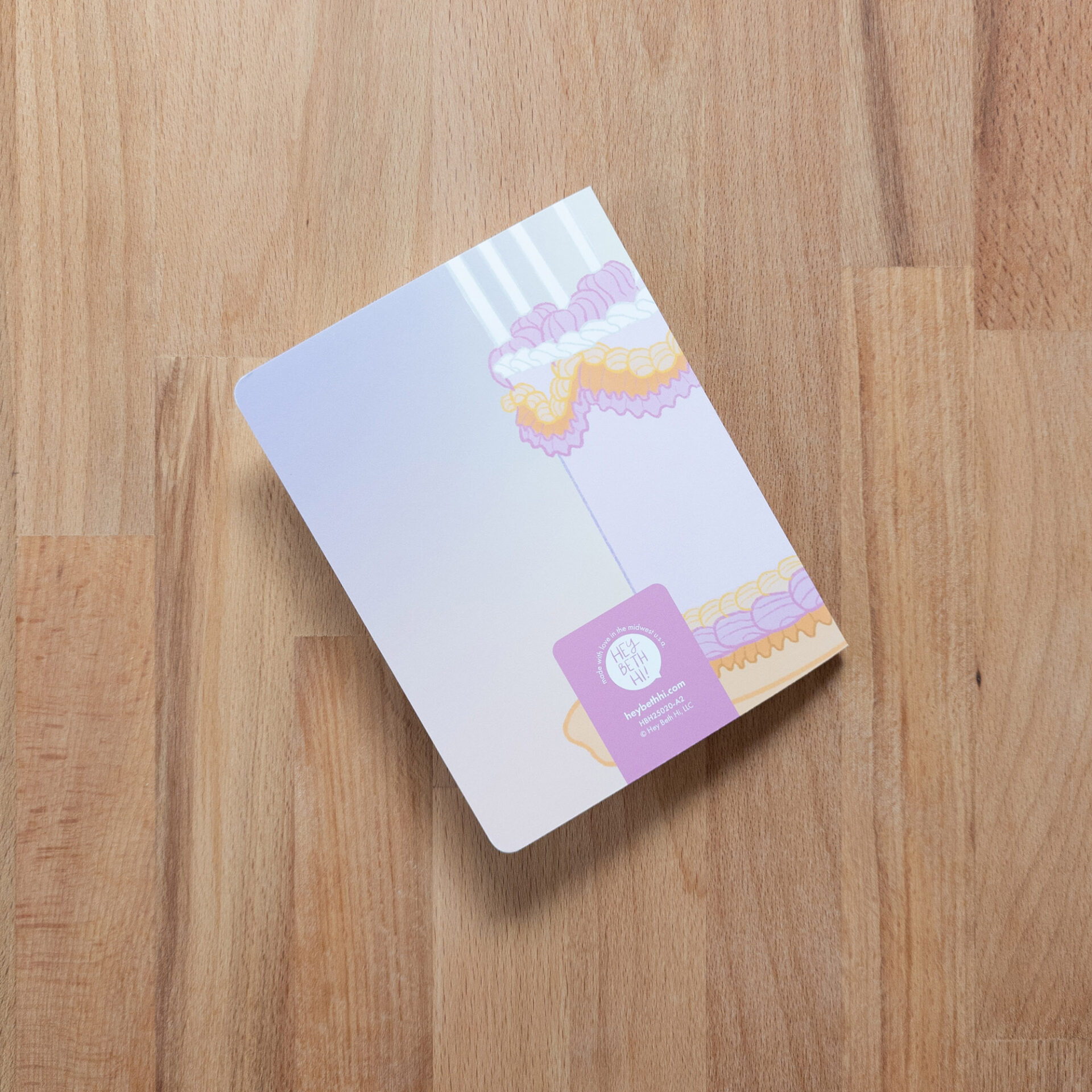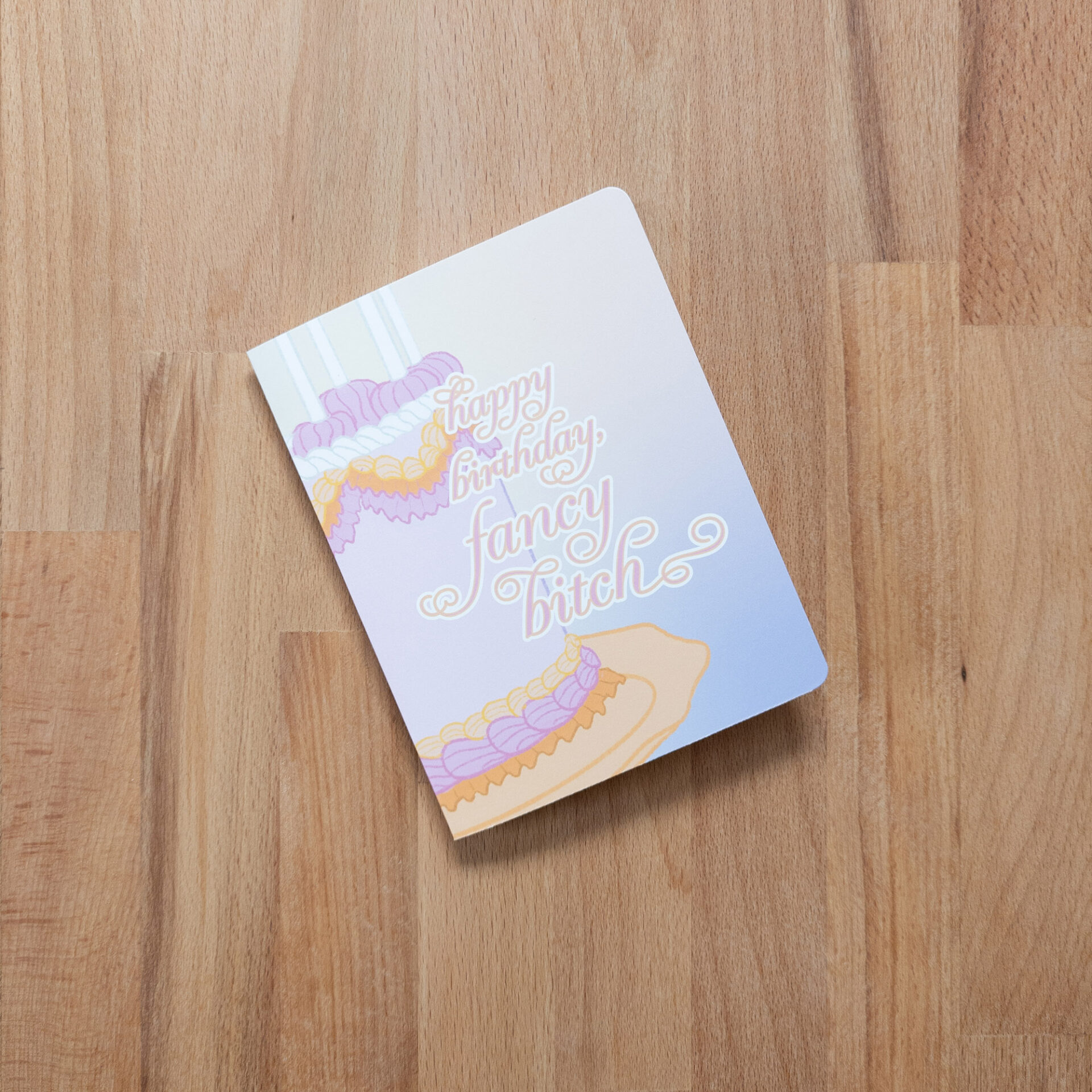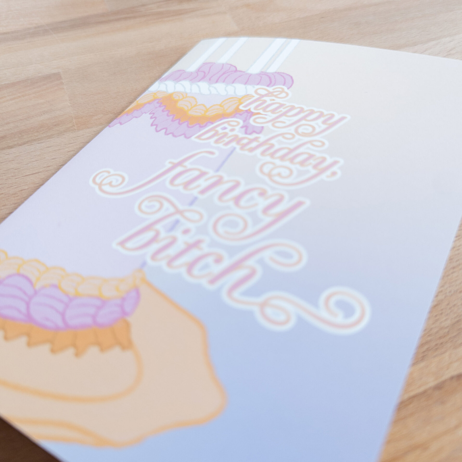 “Happy Birthday, Fancy Bitch” greeting card with a fancy sorbet colored cake with candles. Features a soft purple and orange gradient background with the image wrapping around the back of the card. Blank inside to write whatever you’d like!