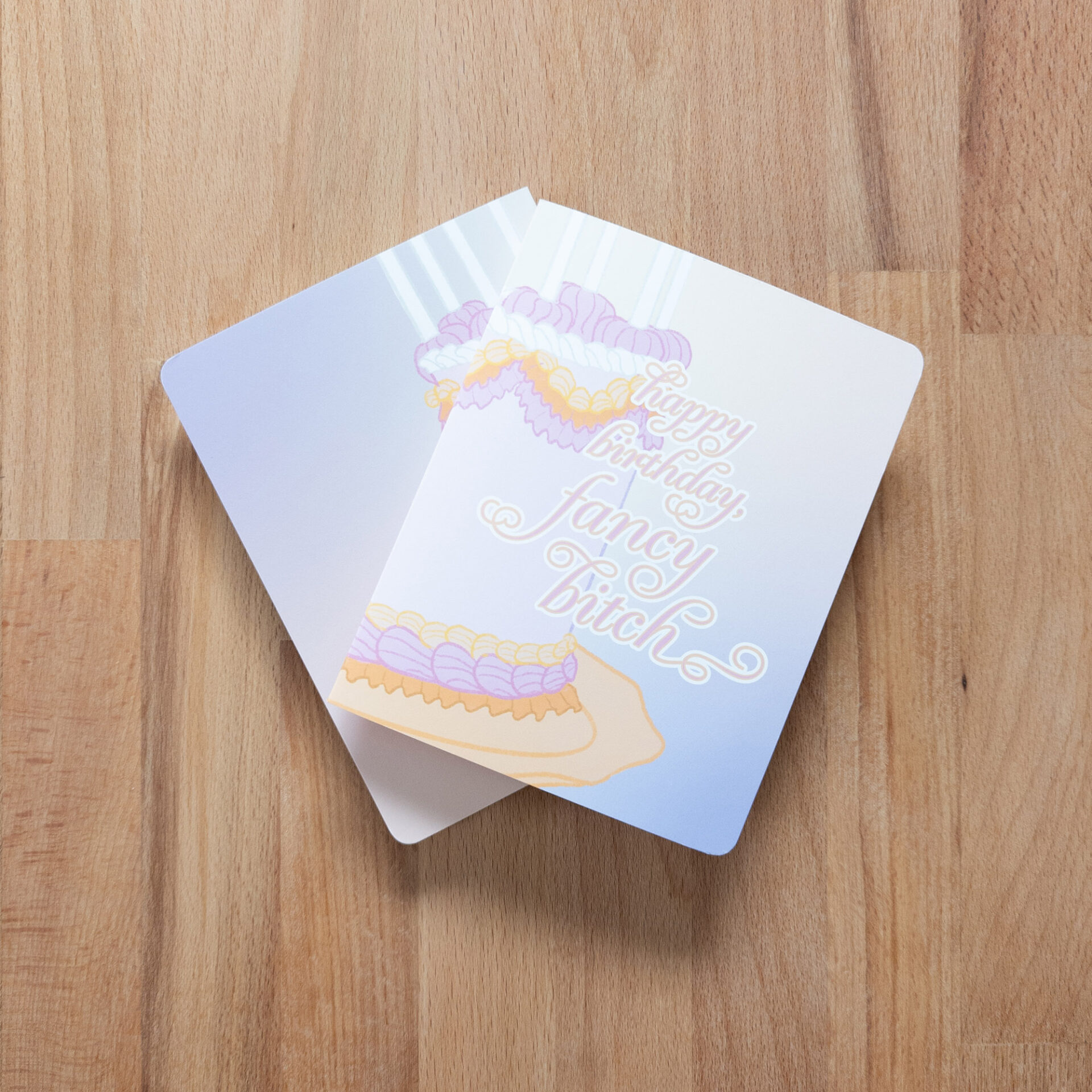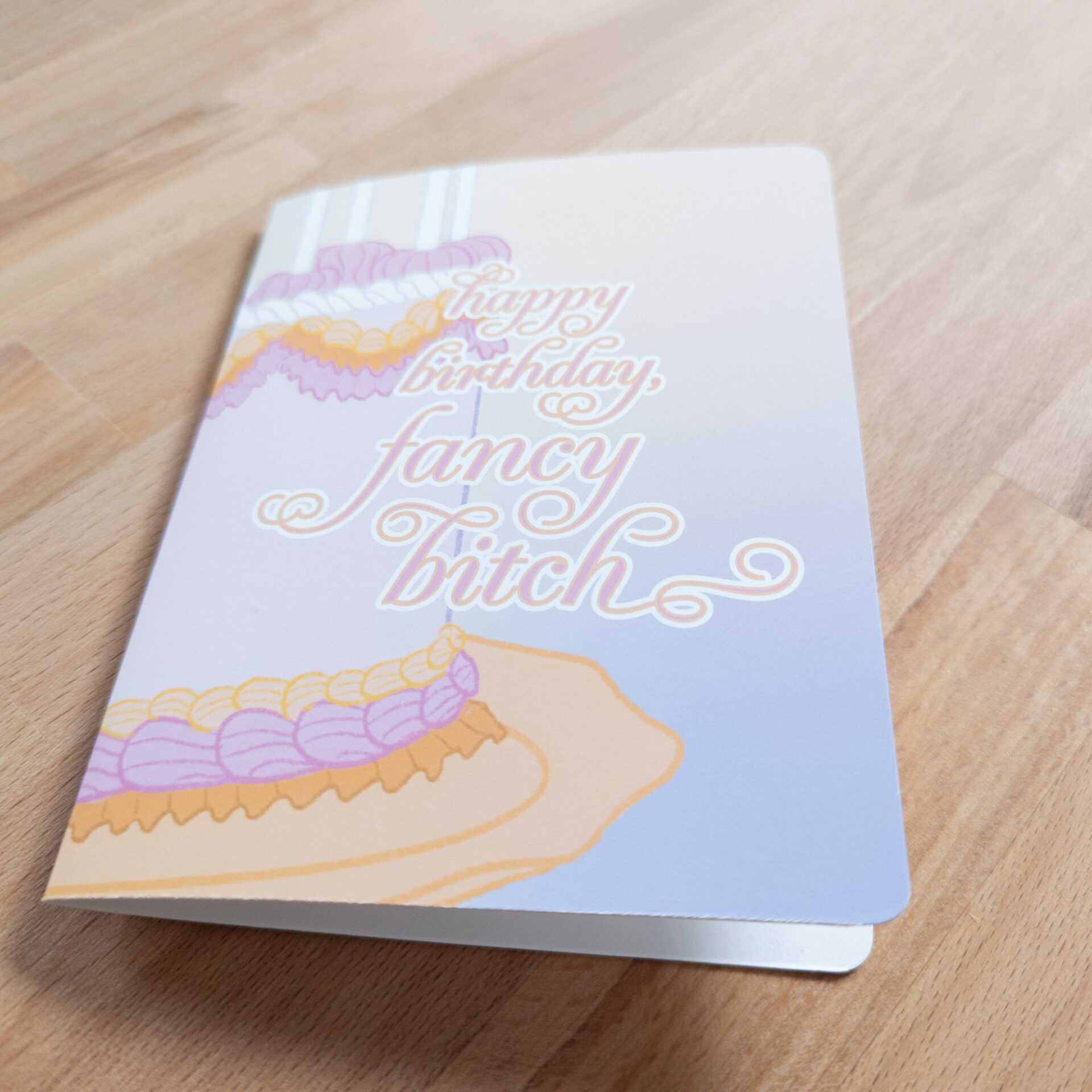 “Happy Birthday, Fancy Bitch” greeting card with a fancy sorbet colored cake with candles. A2-sized card, kraft envelope included. Blank inside to write whatever you’d like!