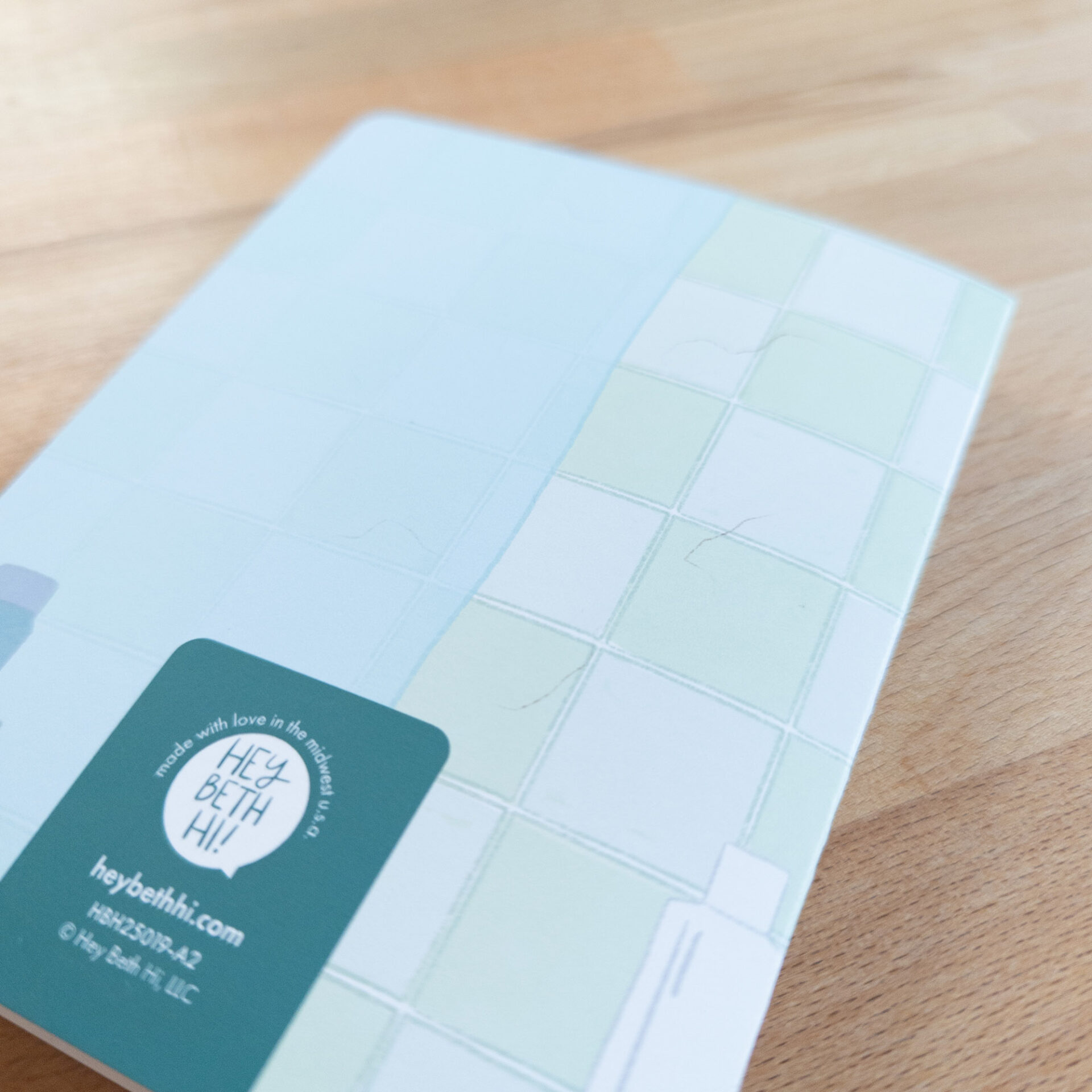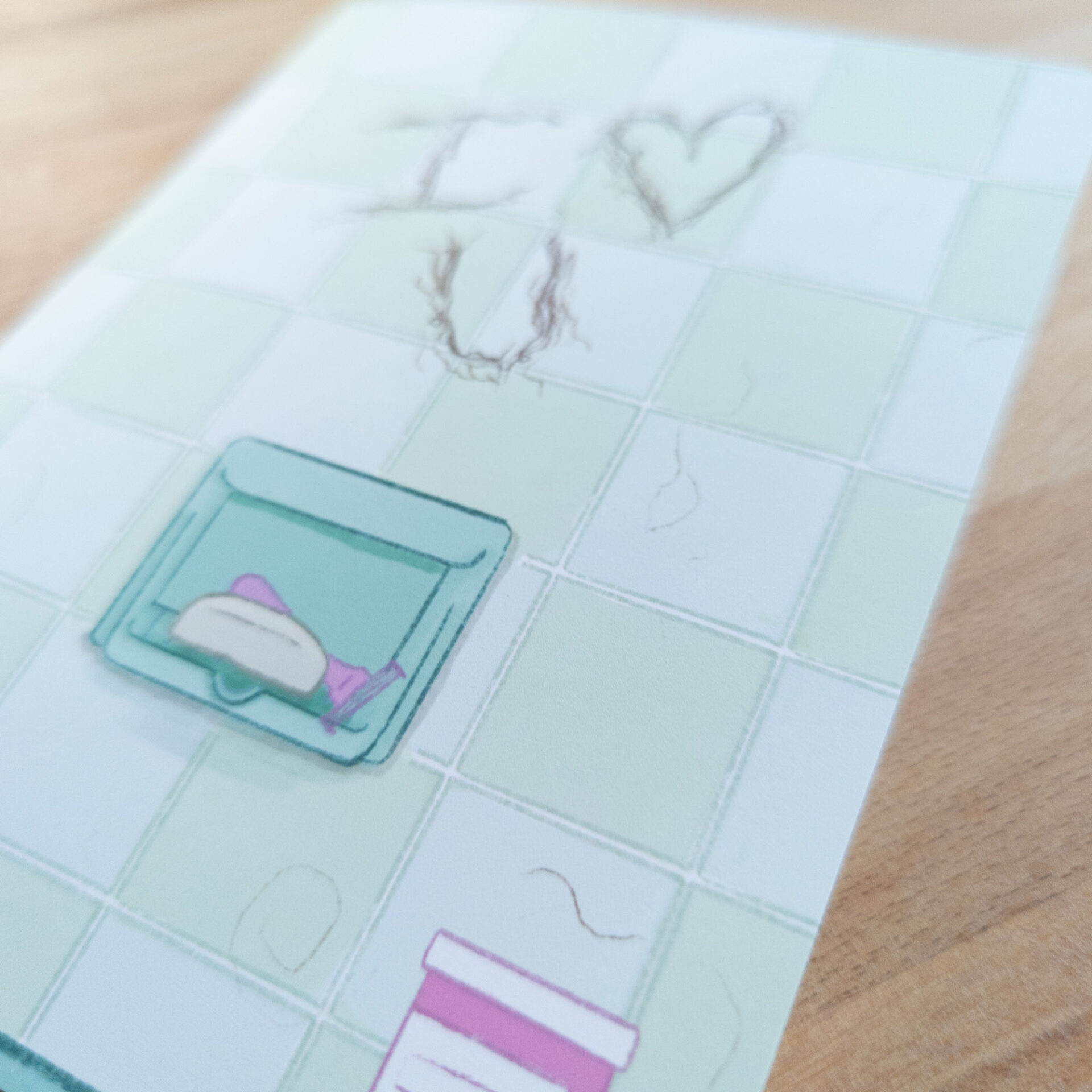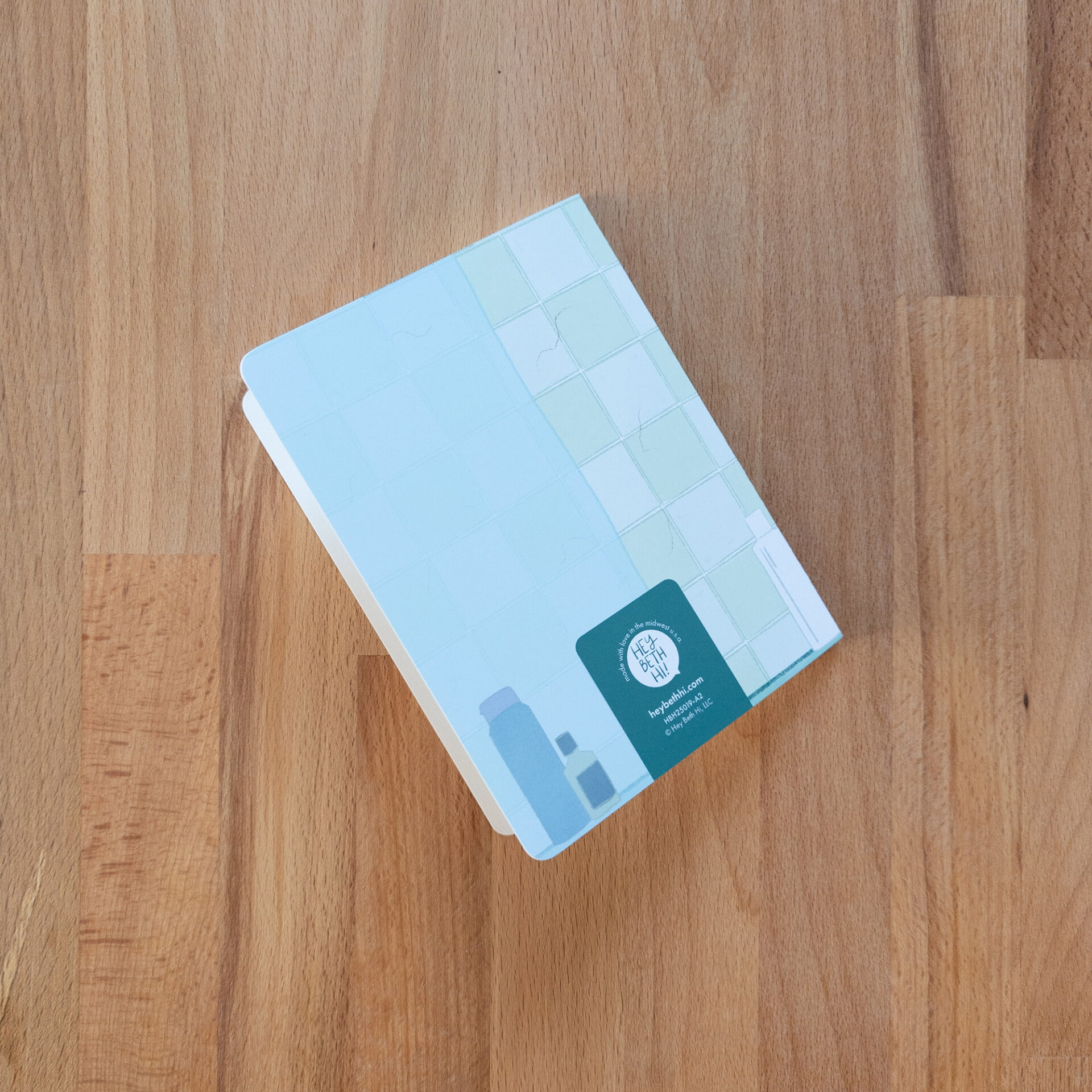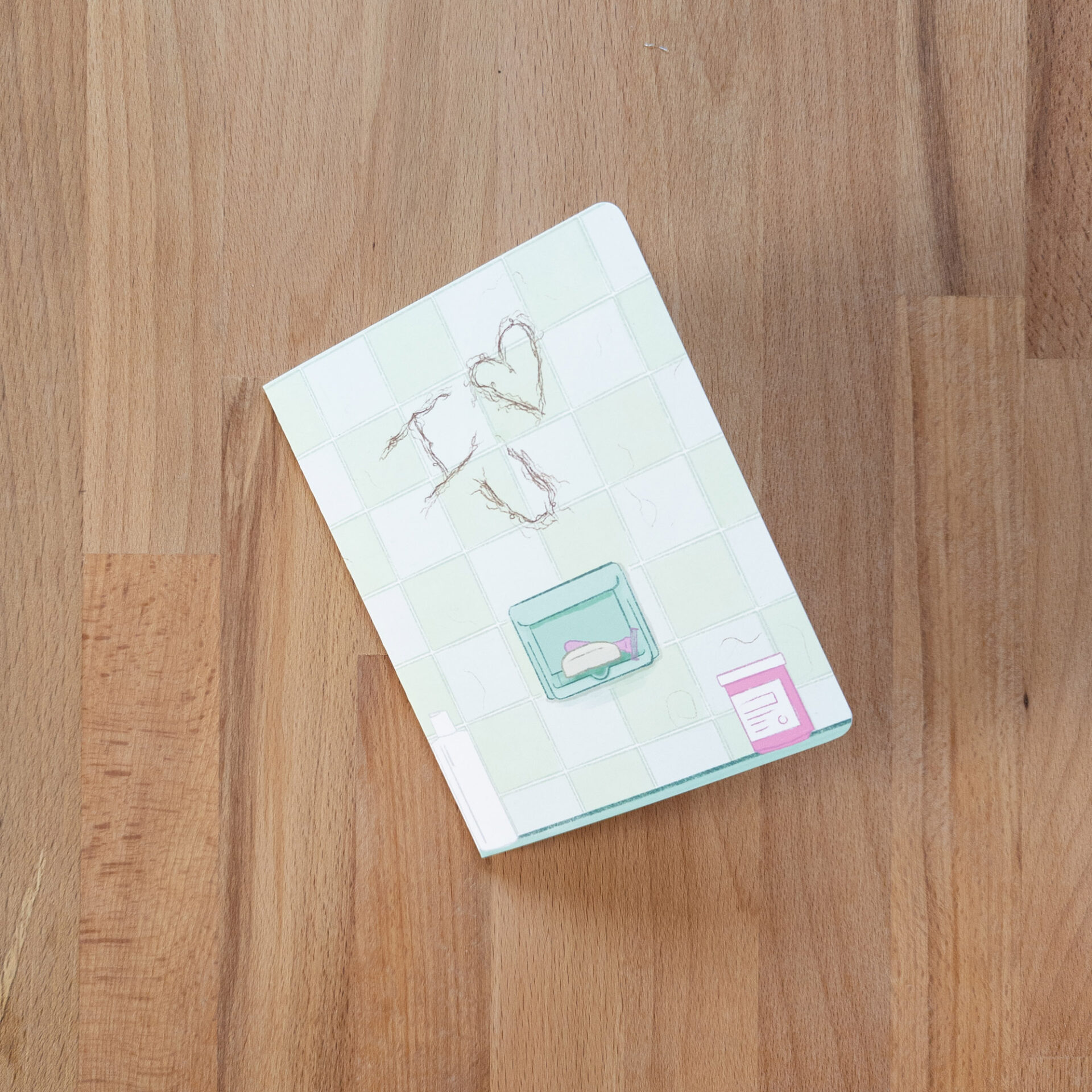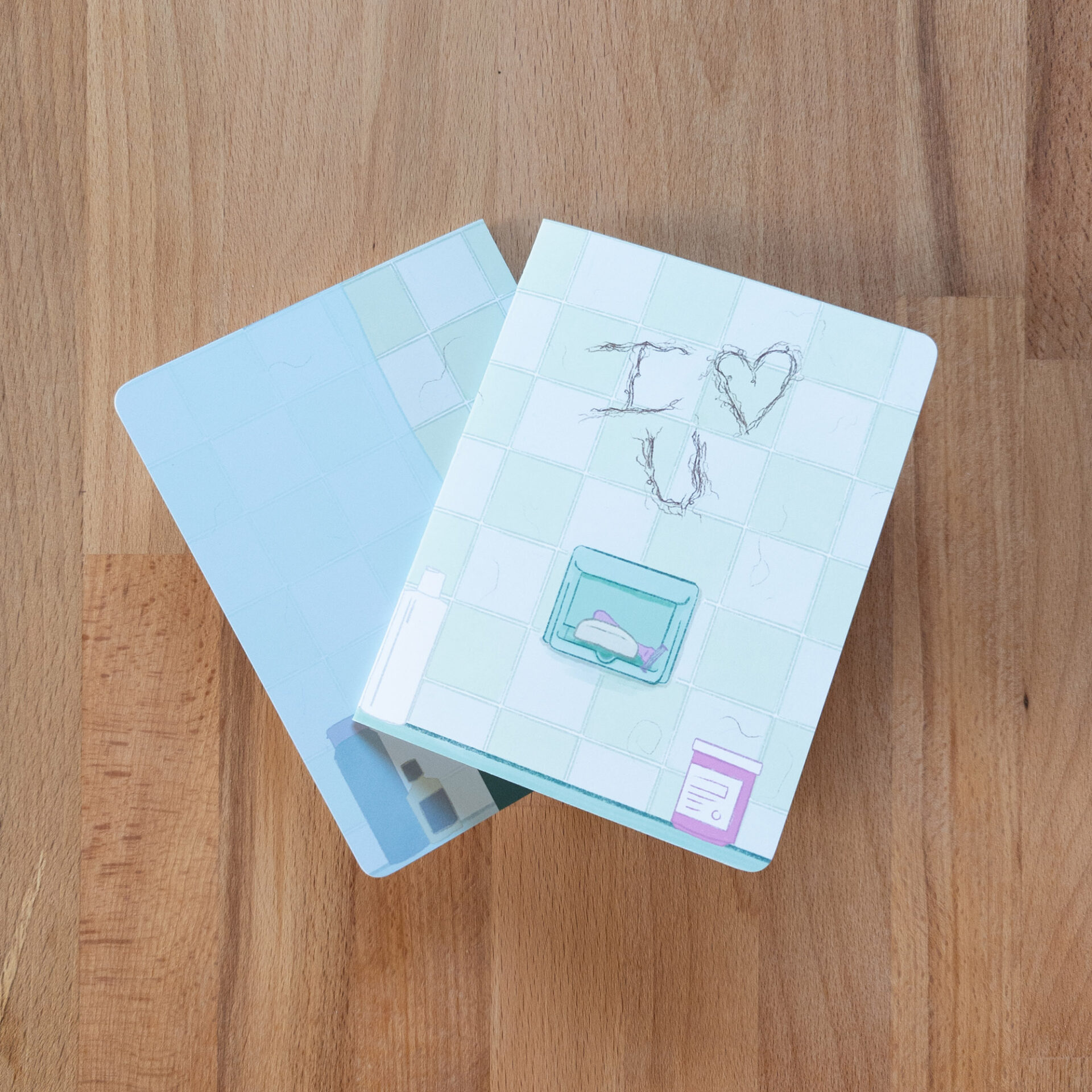 “I (heart) U” greeting card with the card’s message written in hair on a blue-green shower wall. The image wraps around the back of the card revealing a shower curtain. A2-sized card, kraft envelope included. Blank inside to write whatever you’d like!