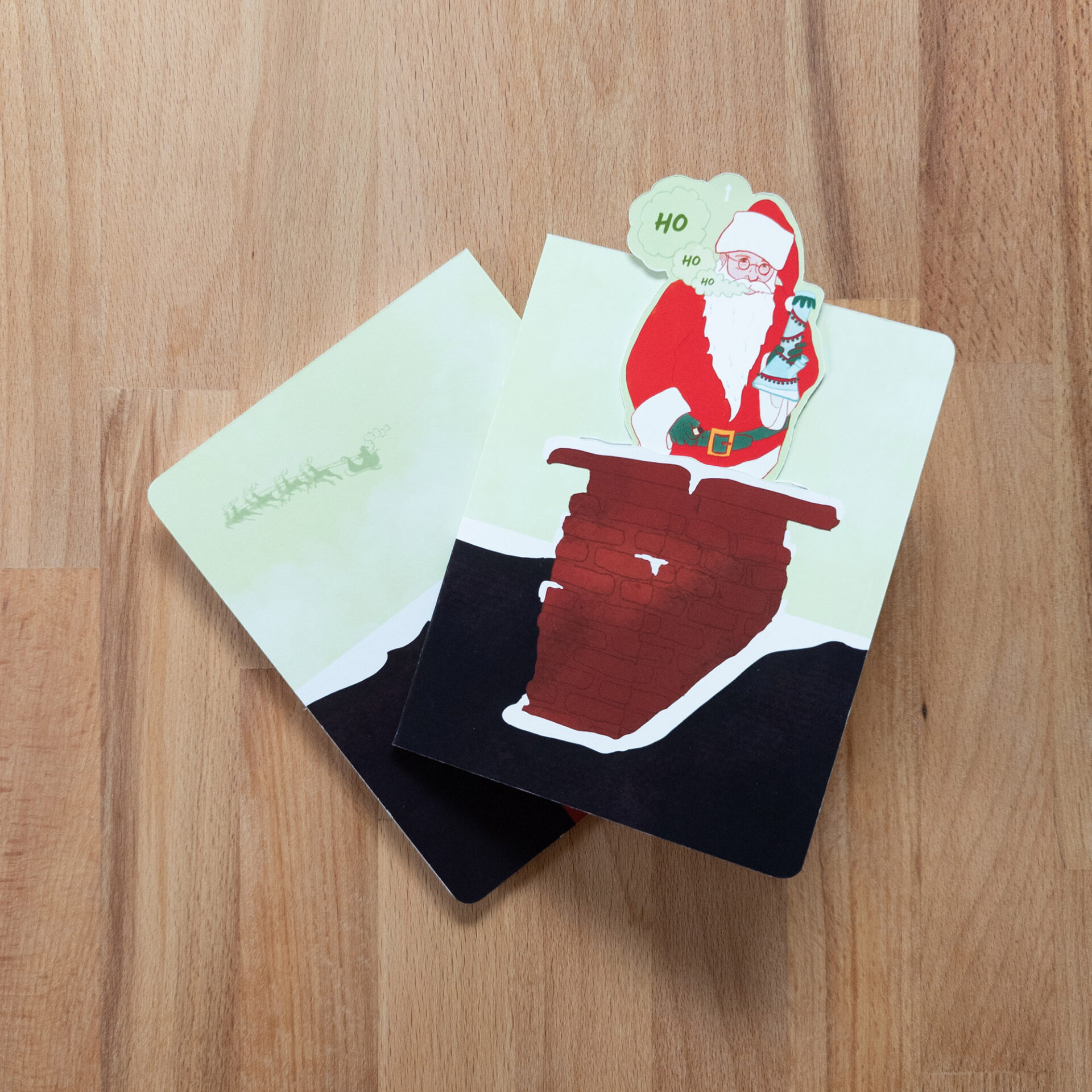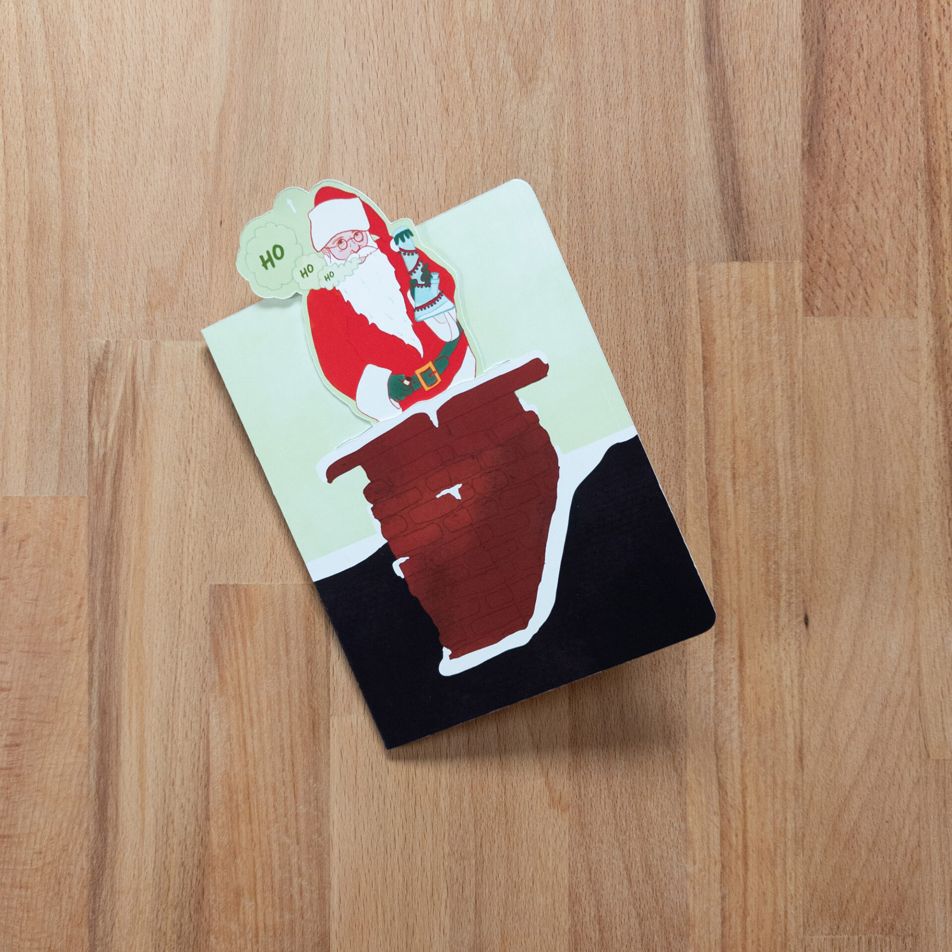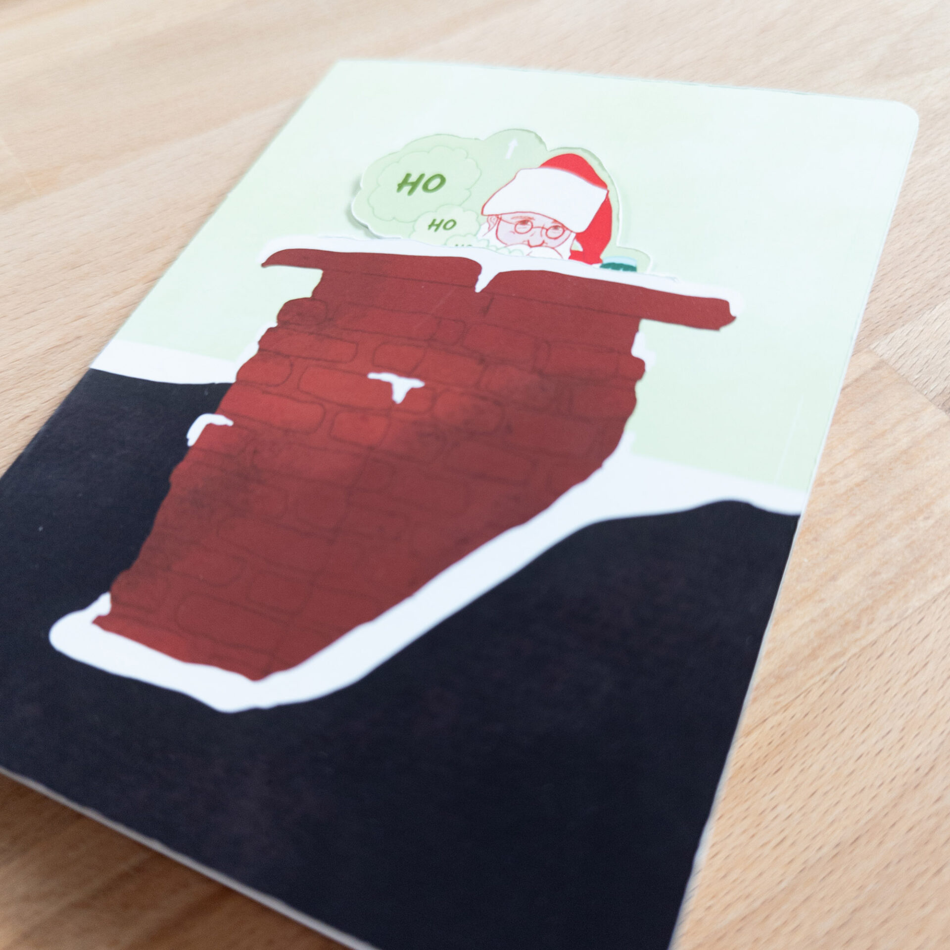 “Ho Ho Ho” greeting card with Santa smoking a festive water pipe, an interactive slider allows Santa to move in and out of the chimney. Features a snowy rooftop with green, cloudy background, the design wrapping around the back of the card, showing Santa’s sleigh flying away. Blank inside to write whatever you’d like!