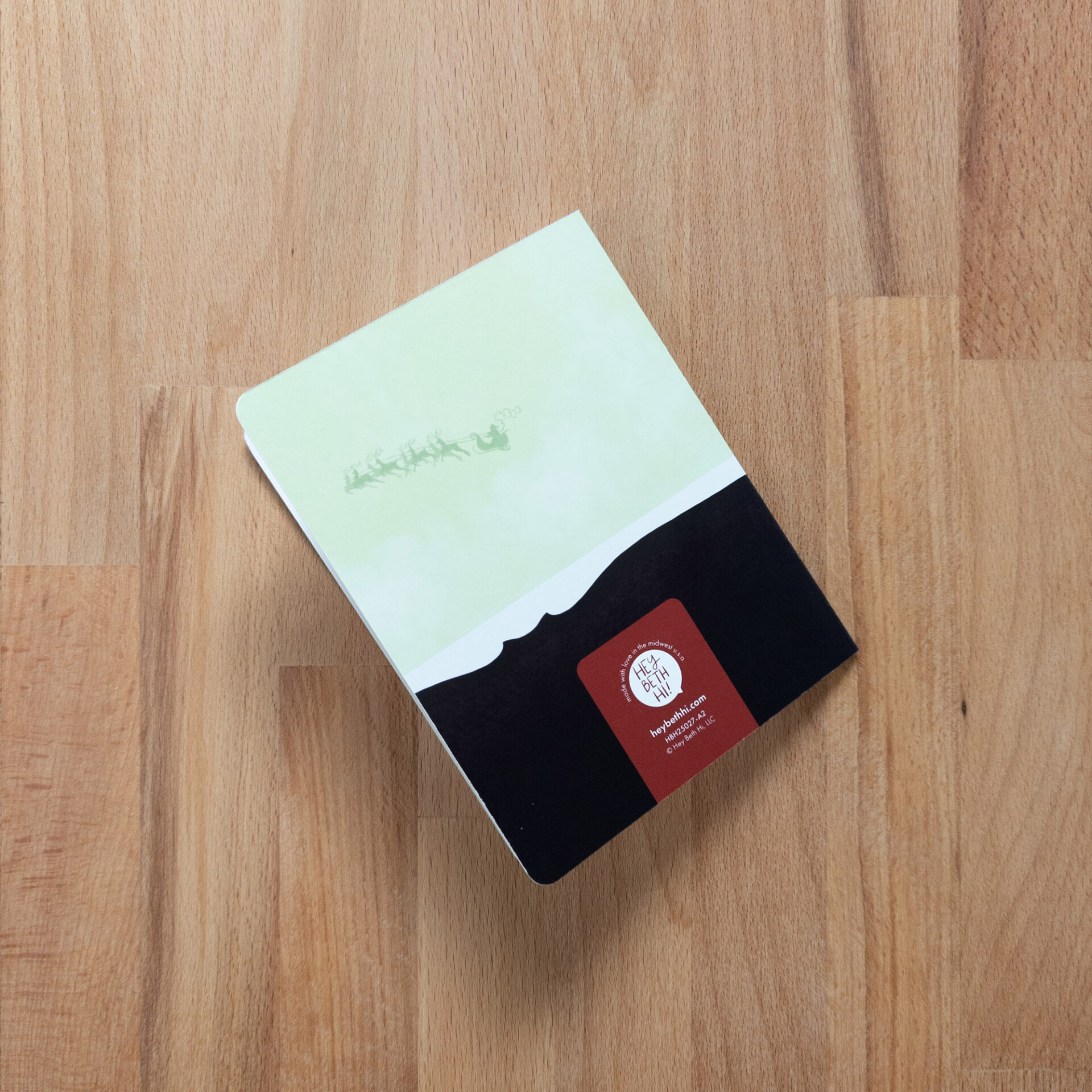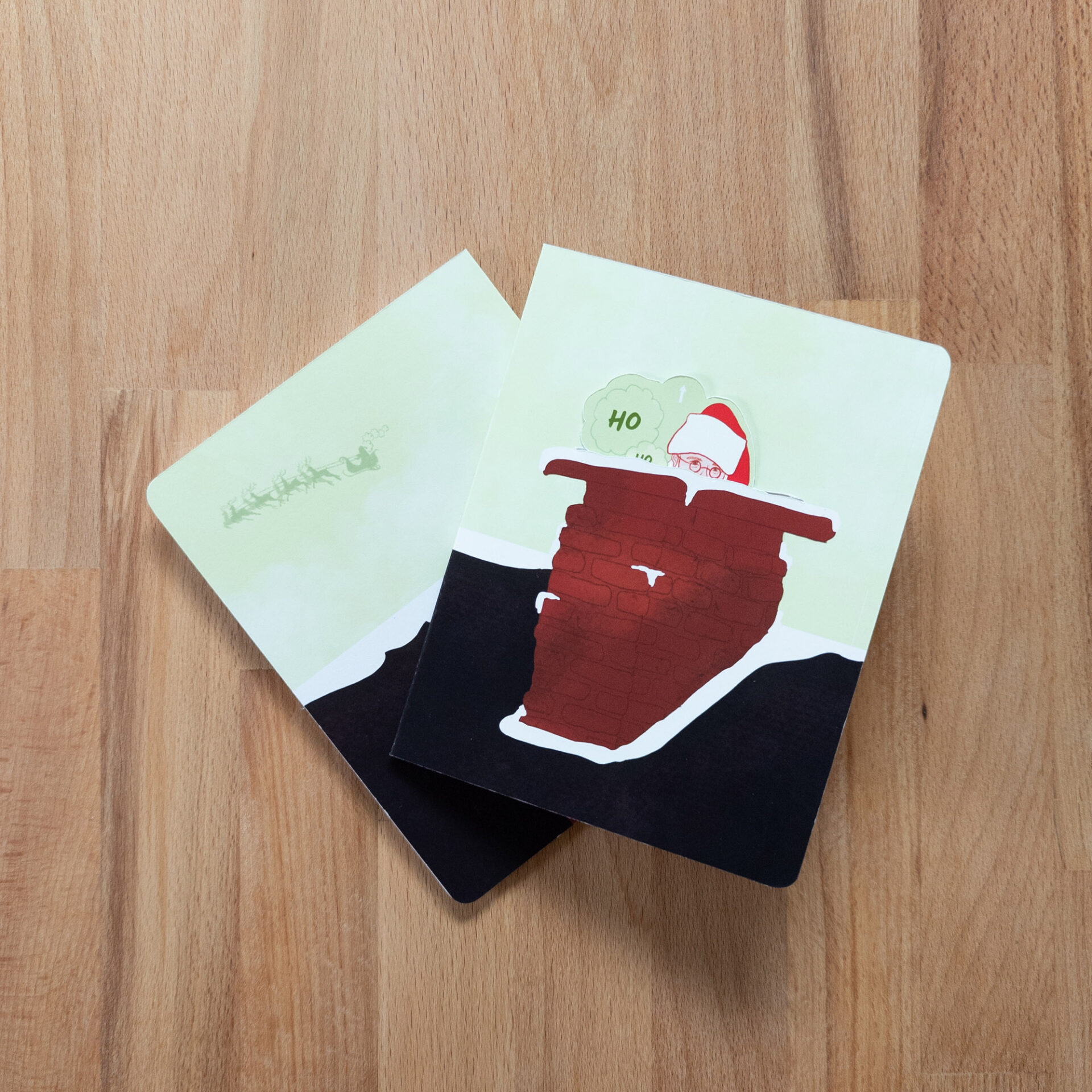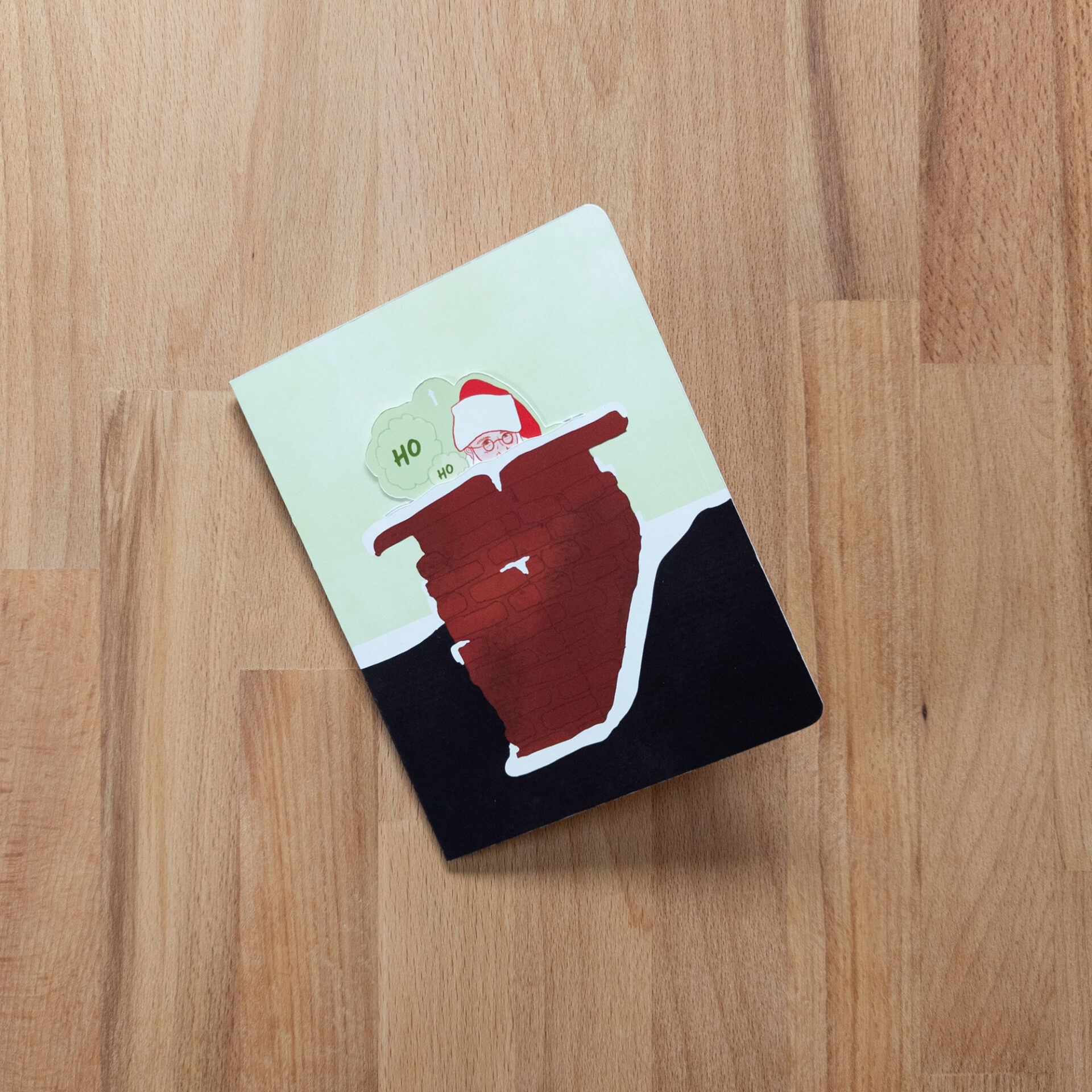 “Ho Ho Ho” greeting card with Santa smoking a festive water pipe, an interactive slider allows Santa to move in and out of the chimney. Features a snowy rooftop with green, cloudy background, the design wrapping around the back of the card, showing Santa’s sleigh flying away. Blank inside to write whatever you’d like!