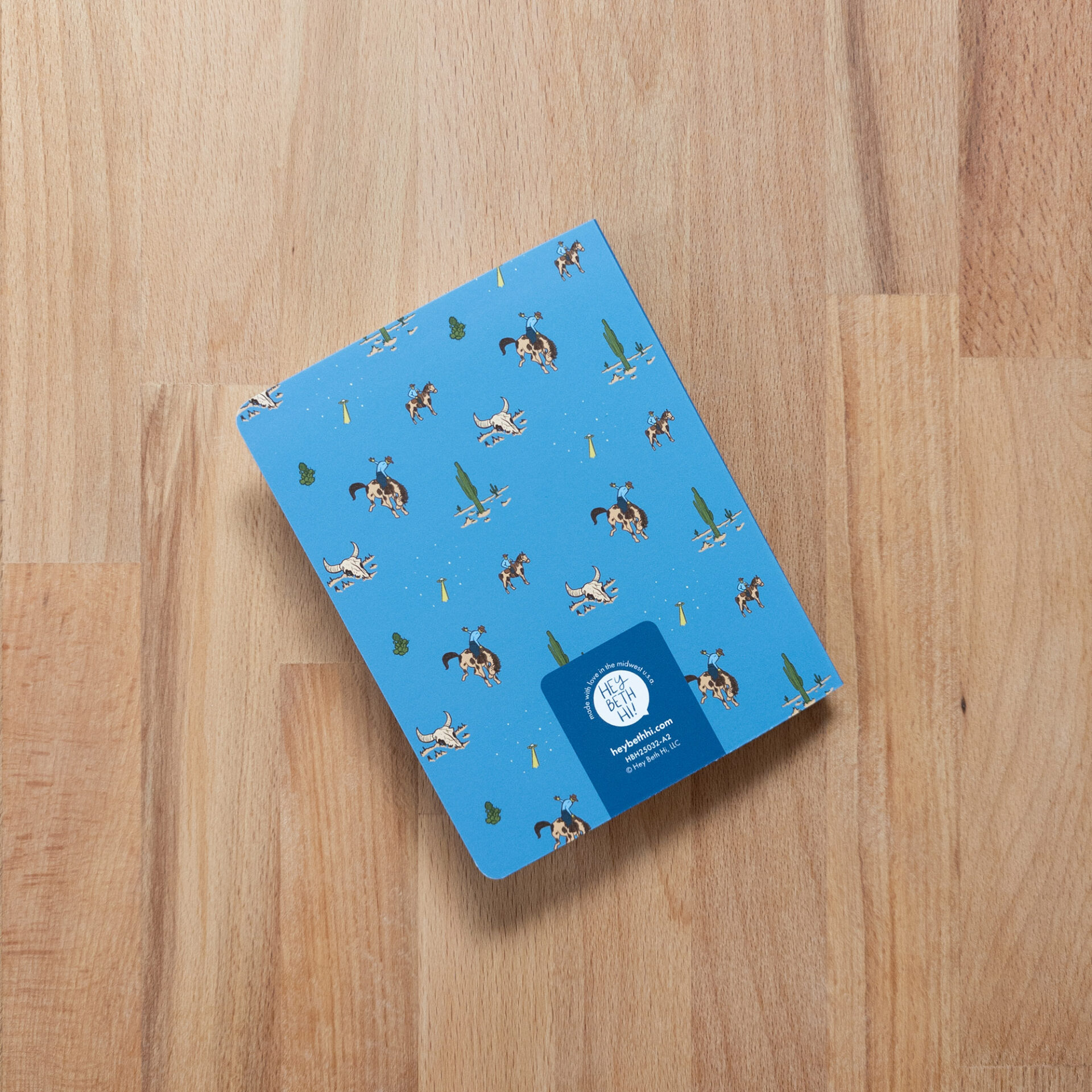 “Howdy” greeting card with a portrait of a green alien wearing cowboy garb and chewing on some wheat. Features a blue oval imitation matte, framing the art. A2-sized card, kraft envelope included. Blank inside to write whatever you’d like!