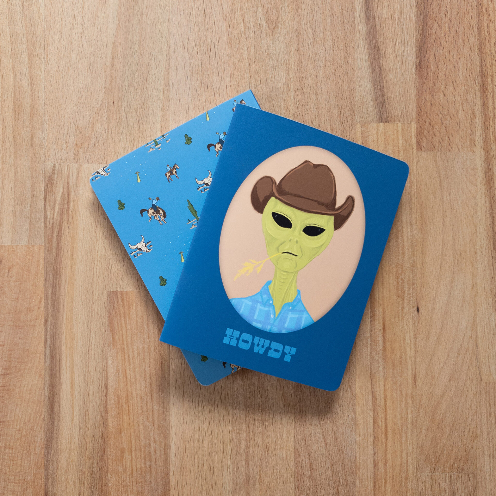 “Howdy” greeting card with a portrait of a green alien wearing cowboy garb and chewing on some wheat, classic Americana. Features a blue oval imitation matte, framing the art. Blank inside to write whatever you’d like!
