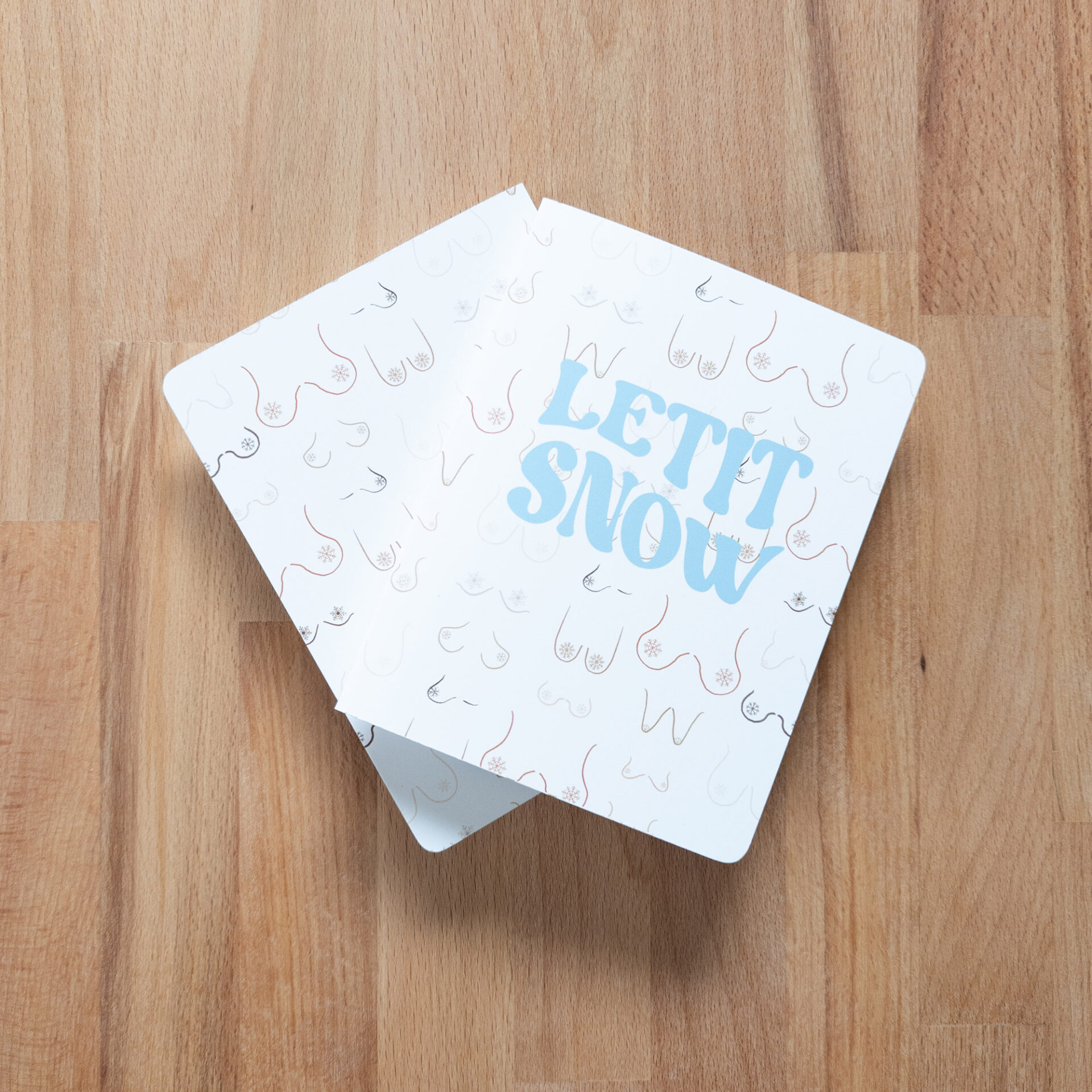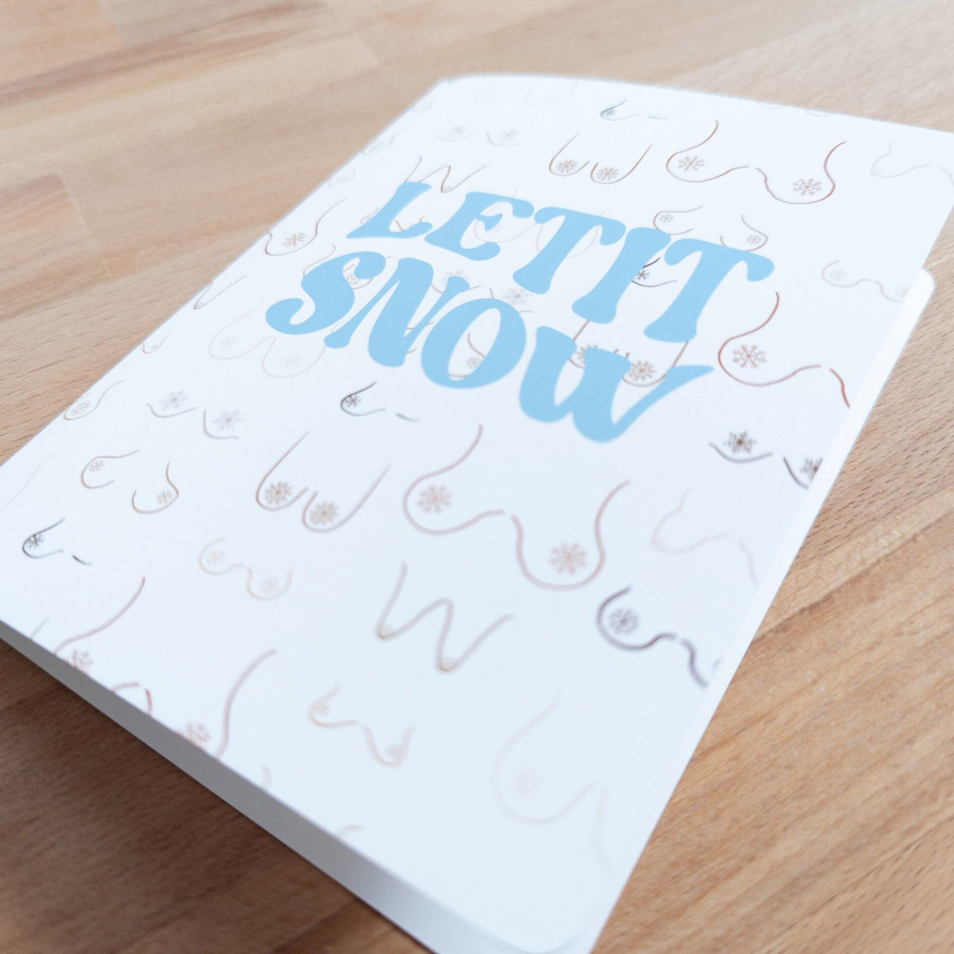 “LETITSNOW” greeting card with a variety of beautiful breasts adorned with snowflake nipples. Features a classic white background with the design wrapping around the back of the card. Blank inside to write whatever you’d like!