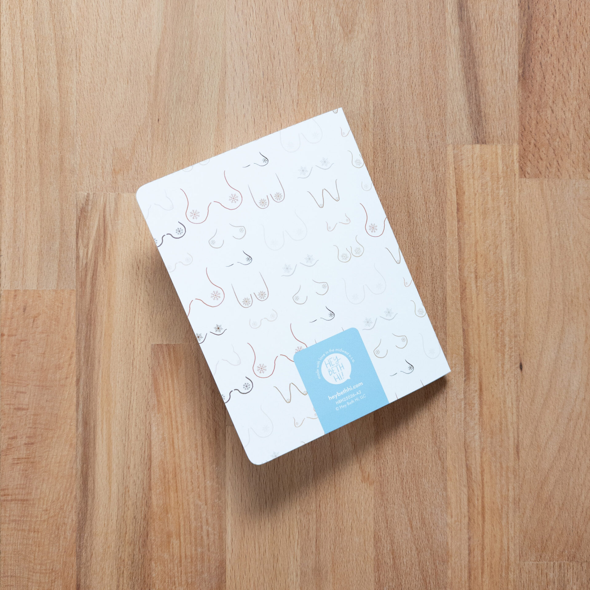 “LETITSNOW” greeting card with a variety of beautiful breasts adorned with snowflake nipples. A2-sized card, kraft envelope included. Blank inside to write whatever you’d like!
