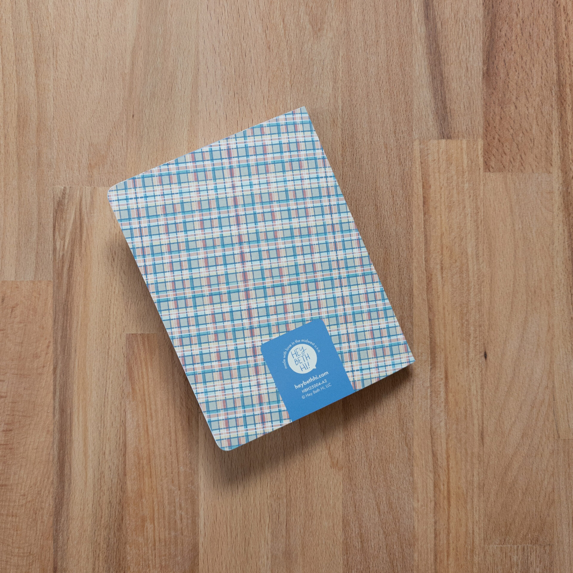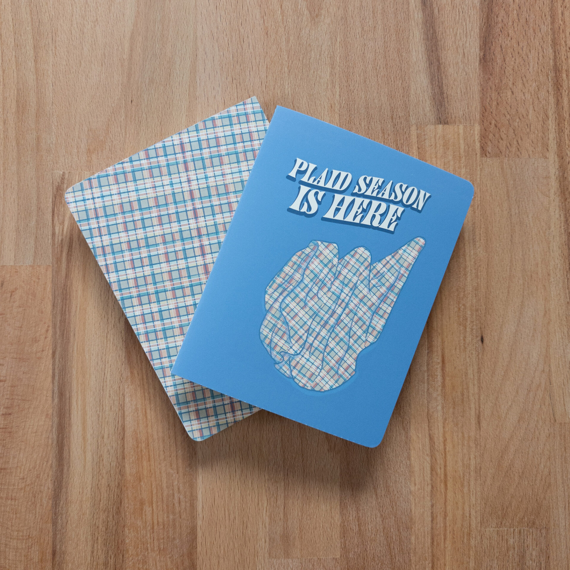 “Plaid Season is Here” greeting card with a sheet ghost gesturing spookily. Features a cornflower blue background with an Autumn-colored plaid design on the back of the card. Blank inside to write whatever you’d like!