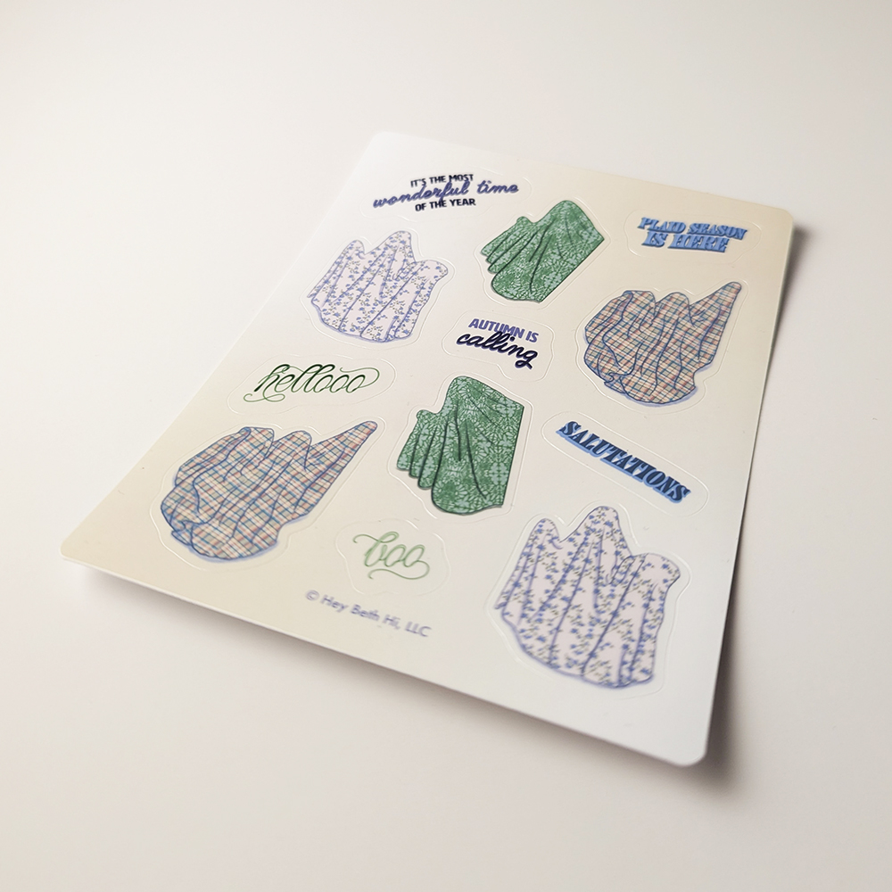 Sheet Ghost sticker sheet includes 12 kiss cut stickers (roughly 1″ in size) with different sheet ghost designs and well wishes for fall. Matches my Sheet Ghost Greeting Cards!