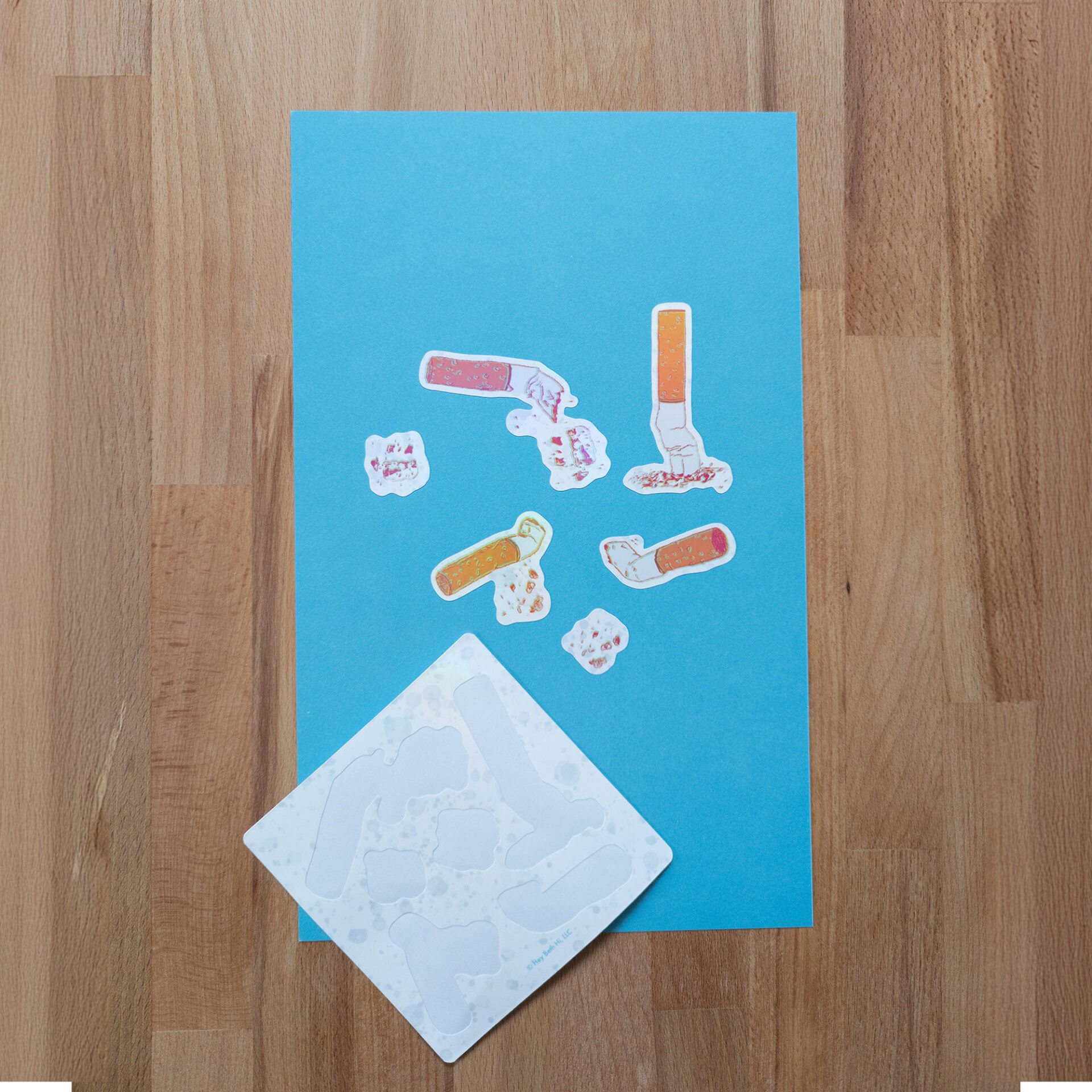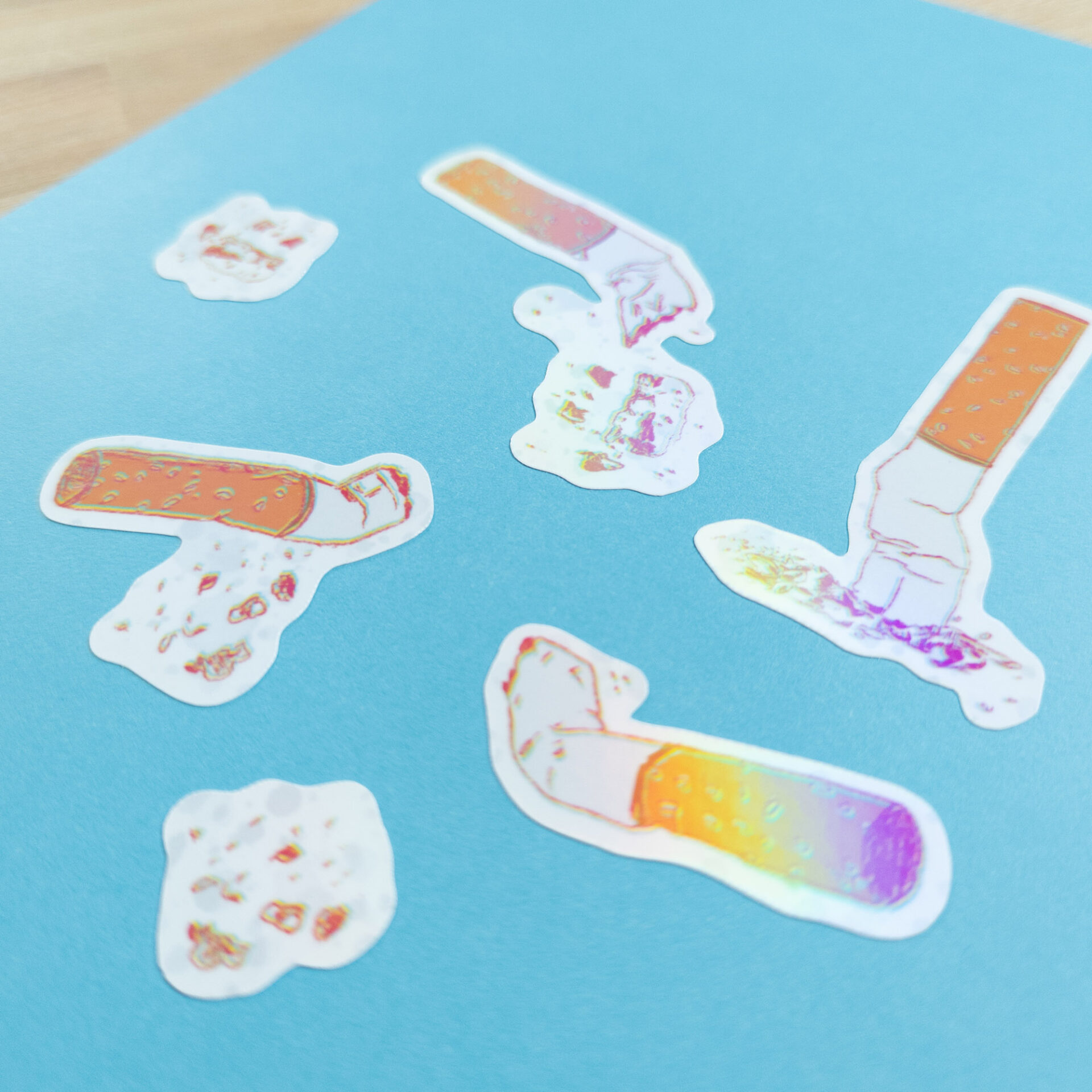 Sticker sheet includes 6 kiss cut stickers (vary in size) with different cigarette and ash designs. Features a subtle rainbow holographic laminate finish.