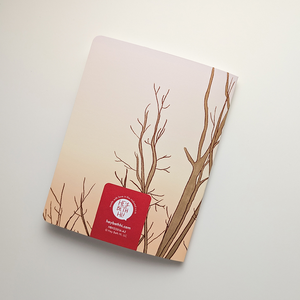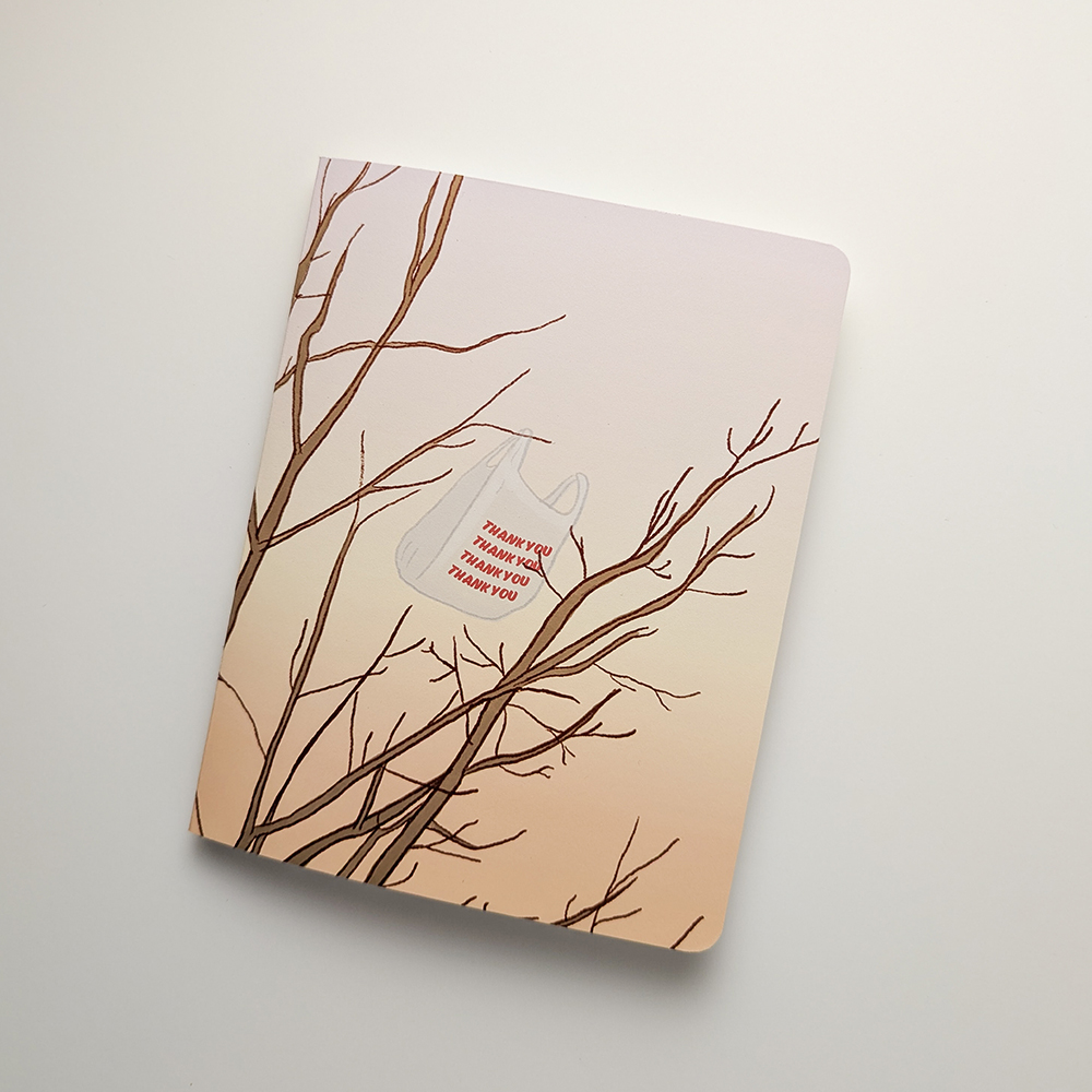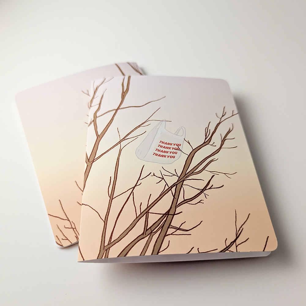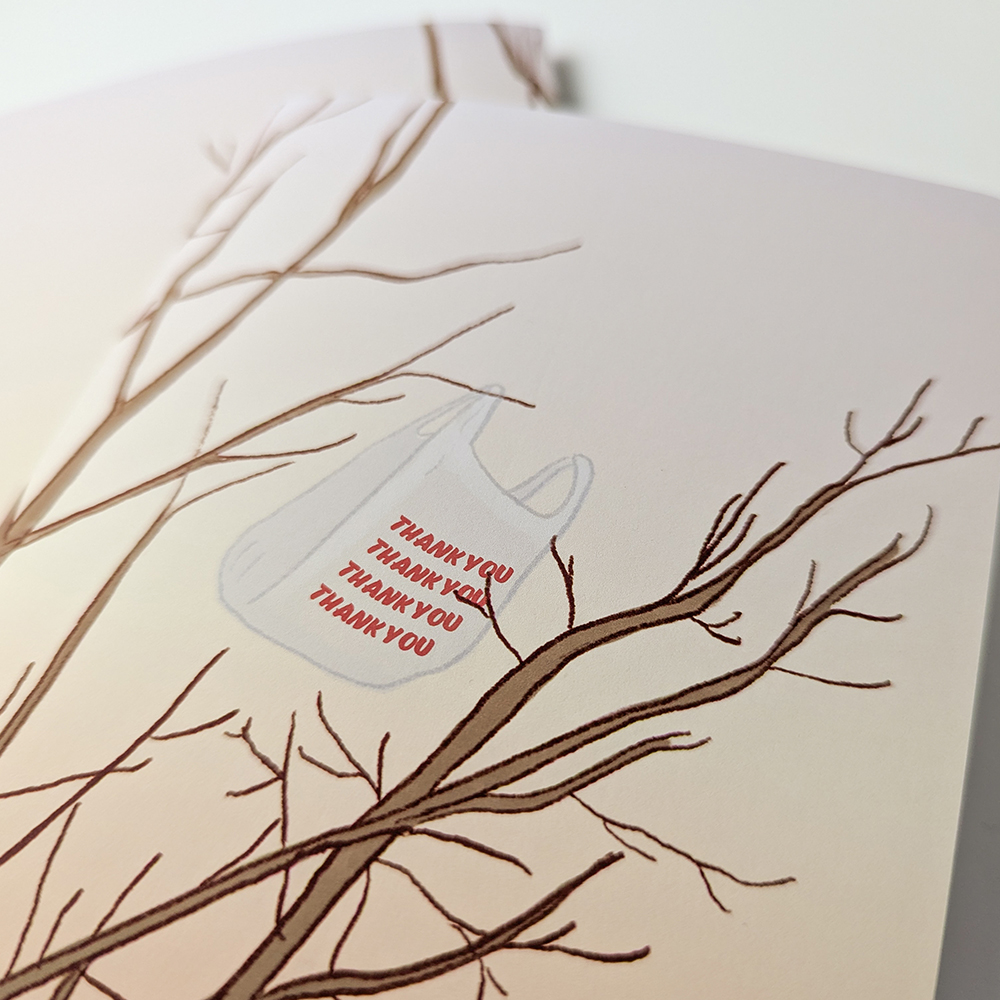 “Thank You” greeting card with a plastic shopping bag stuck in a tree. Features a soft sunrise in the background. Design wraps around the back of the card. Blank inside to write whatever you’d like!