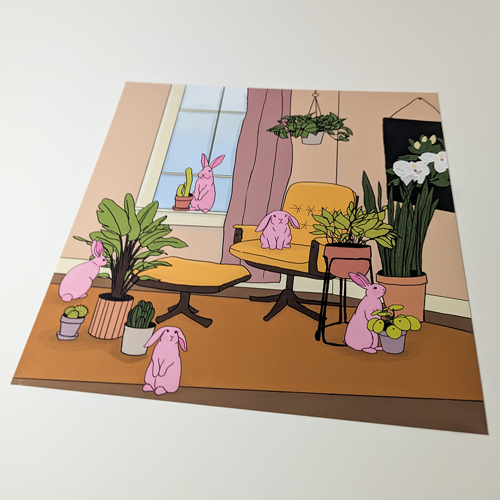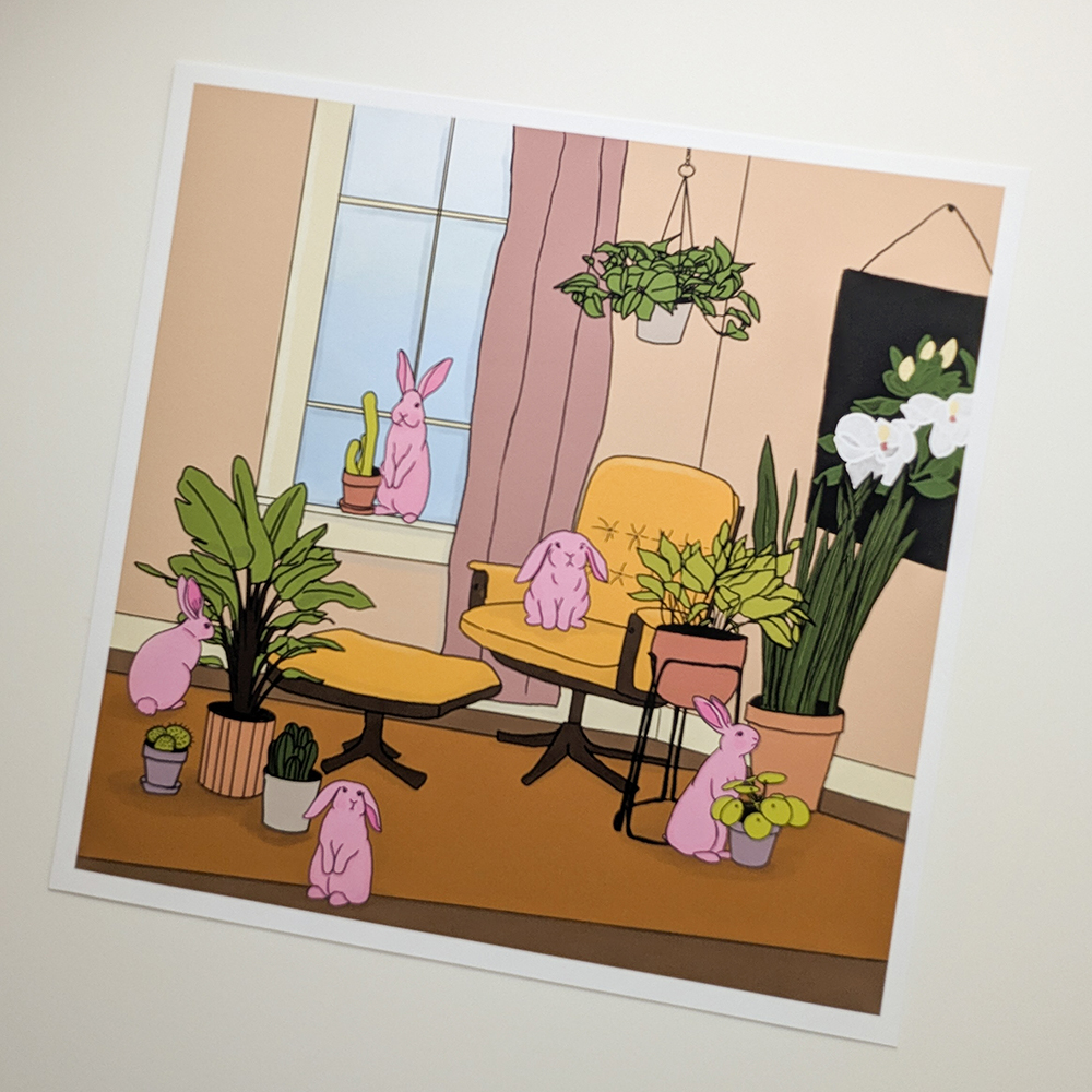 Art print with a well loved, yellow chair in a room surrounded by plants and pink rabbits. This print is available with or without a border depending on how you want to frame it. If framing with a mat, I suggest using the print with a border (an added 0.25″ of paper) so the edges of the print aren’t hidden by the mat.